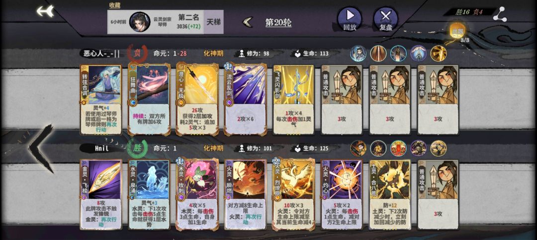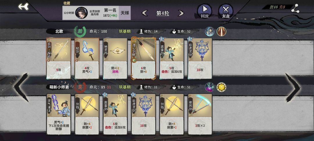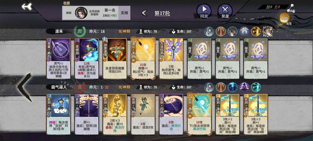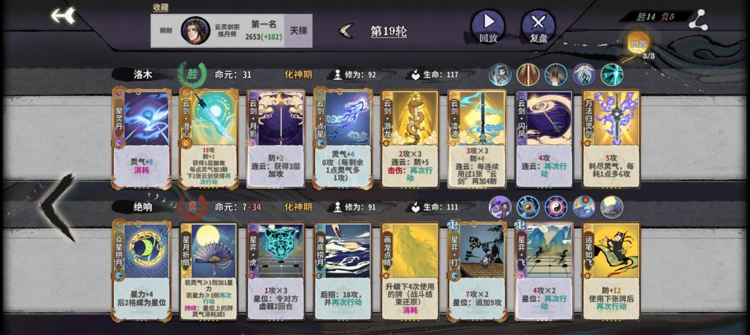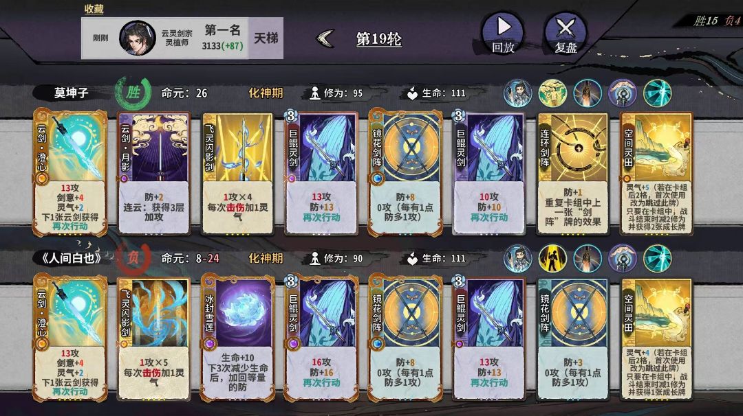 前一段时间一直在玩丹防剑心,当时刚回游,游戏理解比较拉,好多大佬给我指点后,我幡然醒悟,丹防确实能玩,但是锻体随便两个碎防就干趴了,而且成型慢比较看运气。最近挨打了无数把终于明白了云剑的威力。 化神以前我是有啥用啥,基本上就是剑意杀接灵剑,剑宗在对手不是非常欧的情况下伤害还是比较可观的,副职还是丹,除了聚灵,再动云剑,加攻云剑,加灵云剑外其他的牌都可以吃了提修为,只要挨到化神立马换云剑。 化神成型