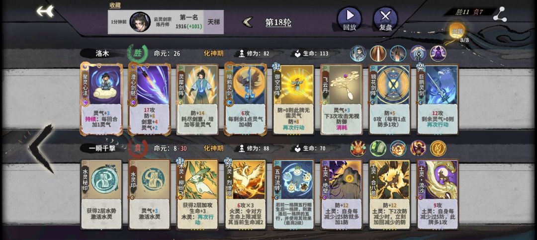 上次发了个灵防的思路,这次没抽到万法归零,就用了镜花剑阵,说实话有点非,化神前因为一直在攒换,基本都是硬苟,化神仙命抽到一个命元➕30才苟到了成型。 纯丹防和灵防思路化身前一样,留剑阵,留加零。这把有我最讨厌的💩土遁,所以一直在留透防,最后一把也是用上了。如果有叶冥冥这种的留净化,具体可以看我上一篇。 最近几把陆剑心丹防真的爽,只要让我活到化神,这把就算不吃鸡也能苟分,属于版本强势了。 最后碰上吴