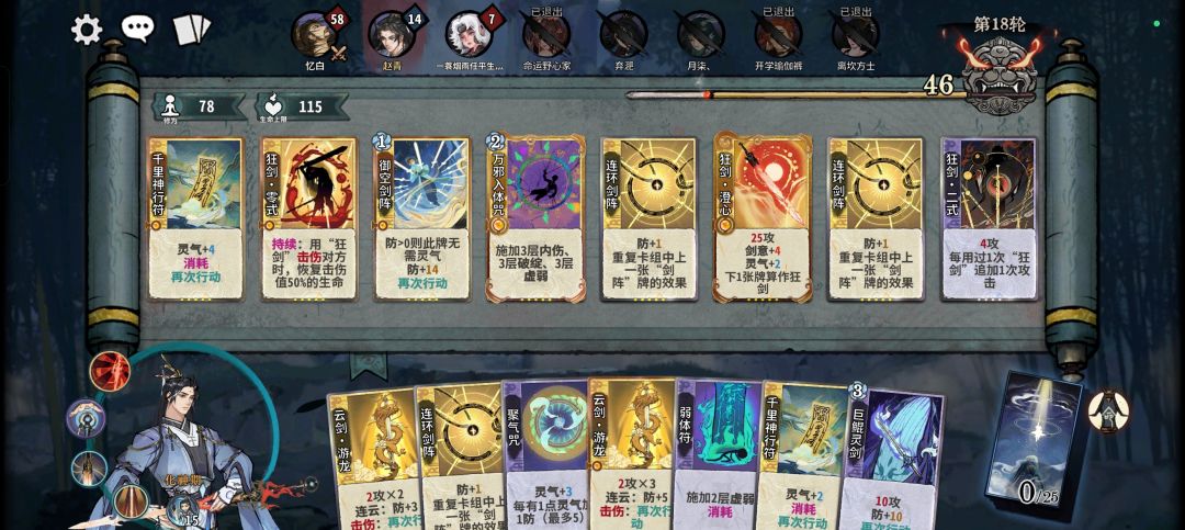 当你突破化神打一局时候没有月影巨鲲这样子的核心牌,仙命有机缘牌也能选,出一个化神宠物牌无论是兔子还是灵鹤都可以用 云剑点星可以加灵气可以再次行动可以打伤害,也是可以用的,如果你的飞灵或者月影等级更高也可以用月影接飞灵➕万法 总之新生玩种田陆剑心直接按套路来就行了,前面加剑意打多段,后面补伤害,多段不行有万法就上万法,什么都没有就不用挣扎了,快死了就牺牲一下澄心,下一把又是好剑胚 套路是一样的,就是