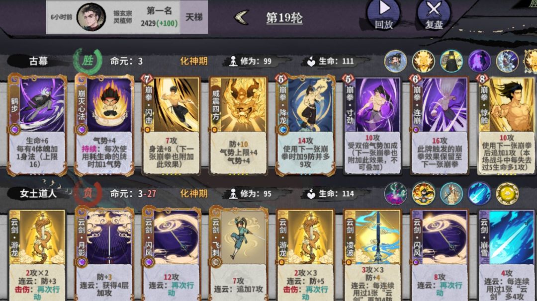 李㵘刚出一天我们也是通宵六千了,强度还是很离谱的,给大家出一期攻略简单介绍一下机制和玩法,毕竟只是上了一个六千而已。 一,仙命介绍 凡躯: 需要注意第一段的无法获得修为只限制炼化卡牌的那一修。回合开始加2修,合牌加修,洗髓丹额外1修,都是正常加修。 灵气转体魄是一定亏战力的。注意,仅仅只是战力,锻玄锻体是可以接受亏战力补锻拿上本节奏的。 双节棍拳前期数值接近一级探马掌,棍接近一级迎风,