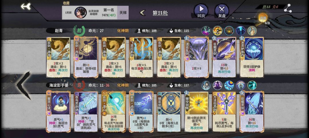 几张图分别是:前期卡组+中期卡组+成型三动杀卡组+成型四动杀卡组+成型乾梅断卡组 副职选命理师(核心牌:恶劫缠身、血光之灾) 仙命选择:除了筑基期的 绛纱守护 不选外,其他基本必选。筑基仙命可选加卦象、加灵气、加修为的仙命 过渡思路:前期用星罗棋布、星弈·夹、揽雀尾、天命·飞逝等牌过渡 D牌思路:前期一般是少D,等到元婴开始大量D牌找杯弓蛇影 角色特点:曜灵抽牌多,一般修为会比其他角色高,越快上化