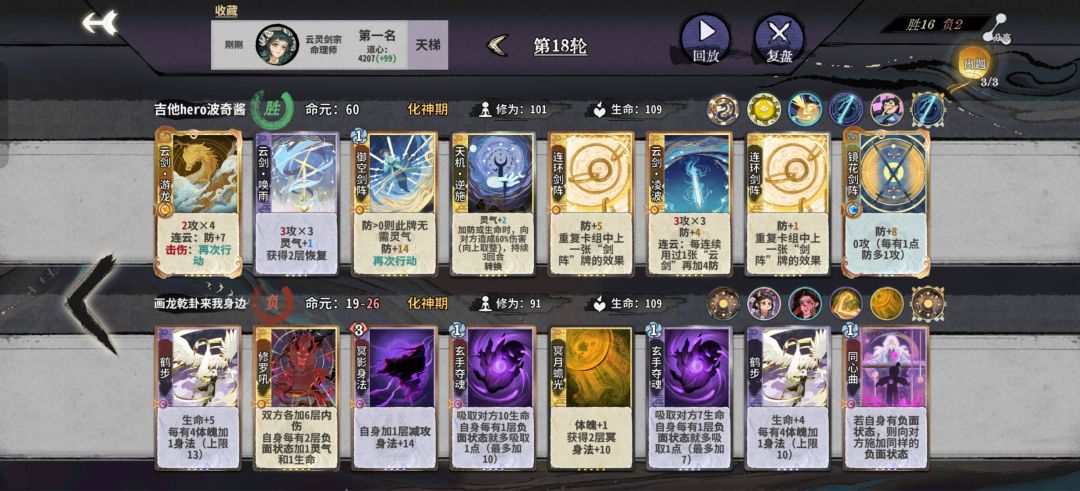 共鸣刷出来休养生息,先别选。副职选择琴师。仙命最重要的就是点生机不灭还有化神的休养生息。 练气把出现的练气副职牌d掉。然后等自然升到筑基。筑基副职牌除了慈悲曲都d掉。 卡筑基别突破,直到有两张2级慈悲曲。化神前,前两张慈悲曲后面全是加体魄牌。 共鸣休养生息等到还剩5-15命元再点,这时候也应该到化神了,然后化神点休养生息仙命。