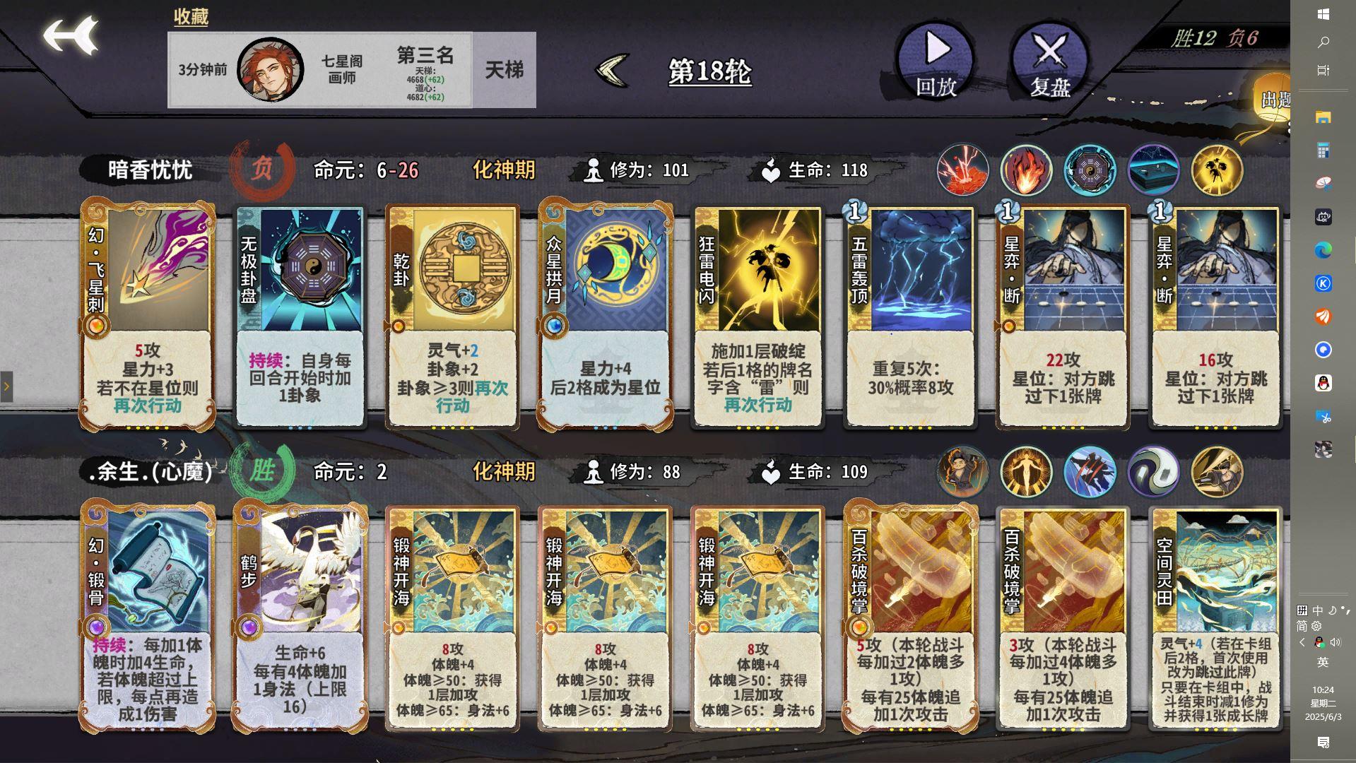 叠甲,仅代表个人看法,求同存异,不同意可以讨论一下。新角色没上手不做评价。 首先是我觉得最强的,叶冥冥:冥代替灵气这个共鸣。 很多人觉得这个共鸣不起眼,其实很逆天。 因为冥代替灵气,导致疯魔这张卡的收益变的超级高。 稳定加2冥意味着两灵气,同时还是高收益锻体叠负面,并且消耗冥还能回血!这让叶冥冥的过渡变得十分轻松,一张能用到化神的灵气锻体卡。 而且,疯魔和冥蟾月光这两张灵气卡,让叶mm化神没有修罗