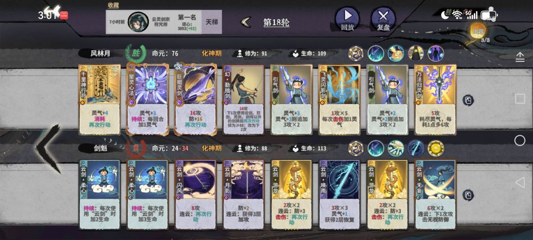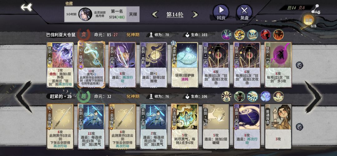#狂剑 #炎雪 #轻剑 #弈仙牌 #弈仙牌攻略 本贴旨在能够在护体丹等级偏低的情况下为大家提供一点博弈思路从而扭转局势反败为胜,对局分段不高,但胜在比较典型。 前情提要:本次对局一个熟练度较高的锦毛鼠幻探云踏云猫,共四次对局。我方手上只有一级护体丹,而对方猫猫修为不低又有高等级游龙破护体,且打法上一直在三动四动杀之间横跳,因此本对局我方较为劣势。 14轮:之前对局猫猫均为四动杀,并且我方低估了锦