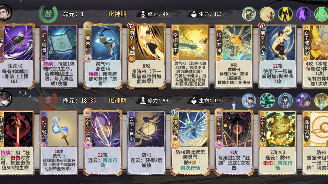 剑宗五个套路,云剑狂剑灵剑剑阵不给再动,剩下点什么呢 哦,原来是这版本之前发挥的一坨的剑意啊 剑意激荡,灵感剑,飞灵闪影剑,万法归灵剑 经过简单的组合,加上从14轮开始给的两次再动,便能得到图1的卡组(骗你的,图一那把我整局没见过灵感剑) 用神行符+聚灵心法/聚气咒来提供启动灵气,幻勤拙把再动给灵感剑/引气剑/剑意激荡/流云乱剑/飞灵闪影剑 缺点是生存能力不足,顶多给对面挂个虚弱,碰到幻斩草和幻火