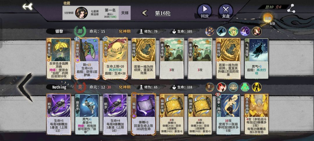 我也是看图4老哥推荐才玩上这套阵容的[表情_开心][表情_开心][表情_开心]确实非常厉害而且稳定,这两天预计用这套上6k 公式摆法如图,注意鹤步不要升3级,双2级即可。 分享一下打这些把的一些理解: 如果我们是先手,可以说没有什么特别打不过的阵容,但仙命只提供三修的情况下,决赛不是偶数轮我们要拿先不算容易。后手的话碰到一些偏肉的阵容就很难玩了,主要是一些三动虚弱卡组,后手的话会被对手先打出7动斩