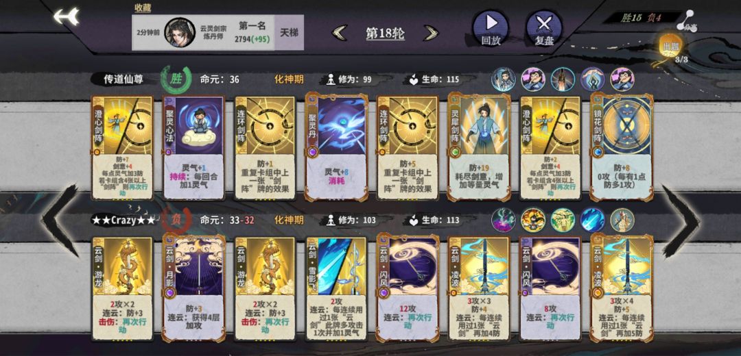 前期说不好听点就是送,反正谁都打不过 当然如果认为自己是欧皇可以前期D一套高质量剑意,过渡,反正困难的时期永远是元婴,真的谁都打不过,就算你D了剑意套在元婴估计也谁都打不过,除非质量够高,真这样的话后面还能成型,活该吃分 然后看着,自己打命元掉到三十几,二十几,十几,上化神,不成形挣扎几下,成型挣扎几下,能不能吃全看狂剑质量,和手里有无对策牌,这两者缺一不可,偶尔先手还是必须的。 纯尽孝套路。
