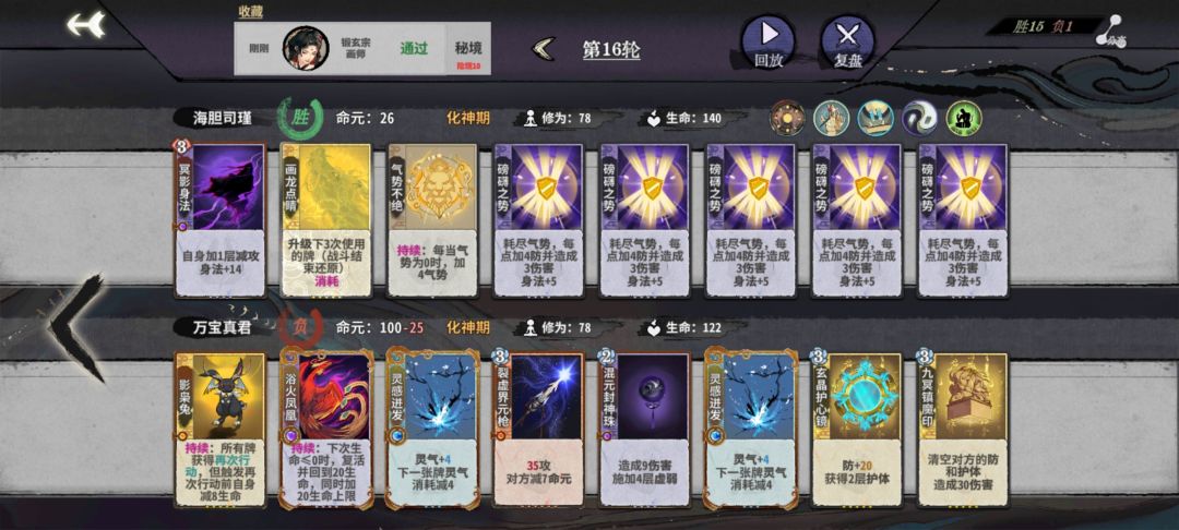 几张图分别是:前期卡组+中期卡组+成型四动杀卡组+成型三动杀卡组 副职选符咒师(核心牌:千里神行符) 仙命选择:除了元婴期的 瓮中捉鳖 不选外,其他必选 过渡思路:前期用白鹤亮翅和坤卦等过渡,前3轮多换牌,组成强力卡多打伤害可多抽牌,4轮后一般都是元婴少量换牌,化神后才大量换牌 炎尘抽牌多,一般修为会比其他角色高