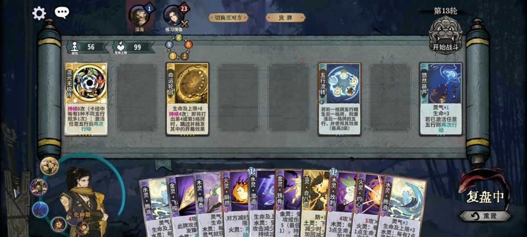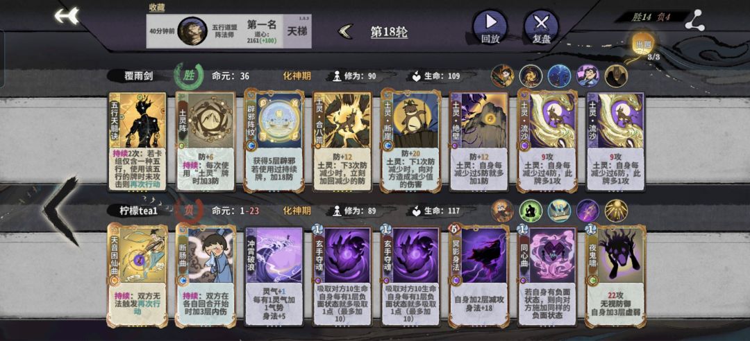 在金仙期用吾行之对战了不少,思路清晰了分享下。吾行之有四套阵容元婴战神答辩过渡阵土和阵水和丹木,答辩只能算过渡答辩不好抽阵土阵水丹木上限更高,要吃鸡化神肯定要转型的。 练气三轮上本,一般用两套水木火或者土金,前3轮都可以D空,然后每轮D一下改善牌组质量,如果五行内战副职丹比较好有护体丹博弈,其它门派就阵法,仙命筑基和化神选本命其它优先修为拿牌,8轮上元婴D空组答辩一套,10轮还没D出答辩一套不要等