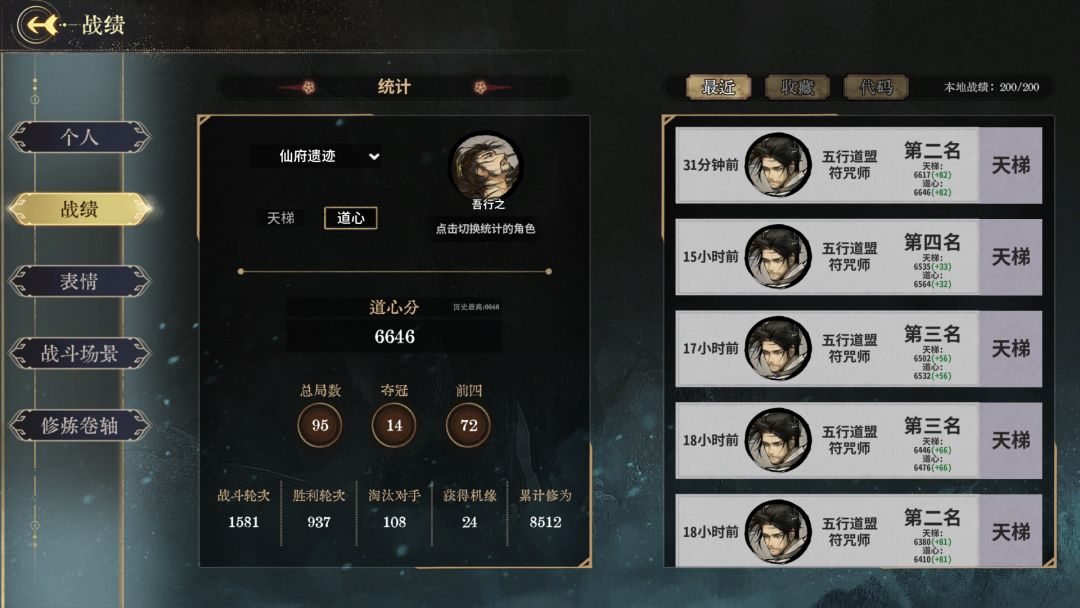 “玄心命坊”赛季吾行之道心万分战绩为:道心10016分,总局数286场,夺冠98场,前四242场。 初步预感新攻略在本赛季中的表现还不错的,为方便道友们的品鉴和试玩,特附上战绩代码,可以在自己的“战绩”界面,“代码”这一栏里输入并使用呦~ 应道友们的要求,本贴将继续补充战绩代码: 攻略已经正式发布,欢迎各位道友们前来围观指导,帮第二~五期点赞4连支持的小伙伴还有机会获得《弈仙牌》周边呦~ 攻略传送