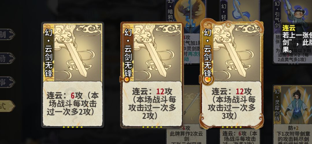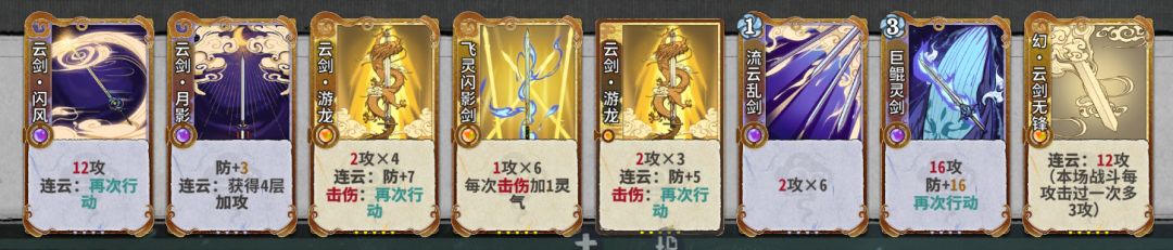 主要是5-7轮,不考虑护体、回血、虚弱等因素,以6张牌内60伤为标准,牌的等级不需要严格按照这个标准,只当参考,有的牌可替换。 1.形意2+凝意2+察体2+引气+巨鲸1+=65+ 2.形意2+凝意2+察体2+飞牙2+猫爪+=70+ 3.形意2+凝意2+飞牙2+猫爪+卜命/无锋/极意+=62/63/60+ 4.形意2+剑档3+察体2+猫爪+卜命2/无锋2+=62/64+ 5.剑档2+凝意2+察体2+
