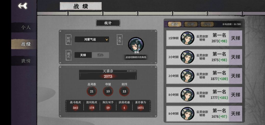 绪论 先上战绩 可见这34把前四率达到了恐怖的91%,即使排除其中的24把天梯胜率也有90%。 可能你会问我为什么不继续用龙瑶打个万分,答案是画龙瑶套路太简单,上分太容易,已经玩腻了。这也是我推荐画龙瑶的原因,无脑上分,基本上可以稳稳前四。 为什么要苟前四? 上分稳定且效率高。如果你是奔着吃鸡去的那么不妨玩玩琴龙瑶或是别的角色。 为什么选择龙瑶上分,副职为什么选择画师? 主要原因是化神仙命的九霄玲