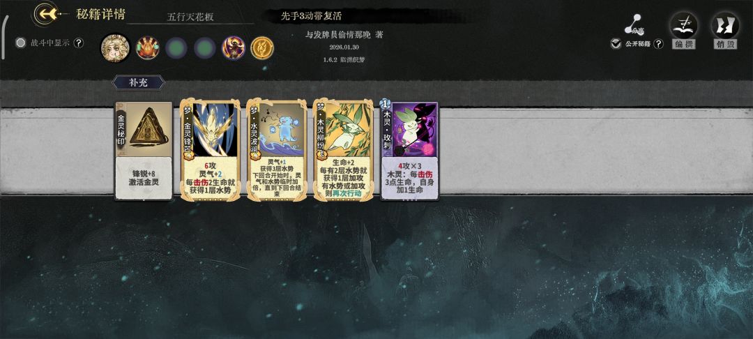 游戏昵称:流水无情叹落花 UID:69608267438c9455b20e512b 1.卡组特点:剑阵流派,攻防兼备,有效抵挡混沌天魔三动爆发 2.核心仙命:金丹期龙鳞保命必拿,能平稳度过前期,有剑阵守护优先拿剑阵守护,在没有水月剑阵的情况下很好用 3.核心卡牌:合势剑阵,由于合势剑阵的被动效果,当卡组中八张都为剑阵时,满级合势剑阵可打出高达39/39攻防,利用连环剑阵重复效果配合镜花剑阵收尾,在