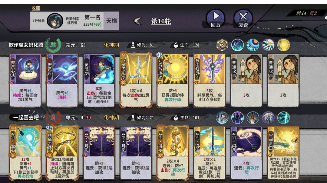 先晒一下五连第一的战绩,直接冲到地仙。 一般来说是万法和防剑两种思路,个人感觉防剑更好。 两者对比一下: 灵剑虽然伤害高,打起来爽,但是成型太晚,中途容易翻车,并且容易被护体克制,如果带多段攻击反制护体,那么就没有了无视防御,万法的巨额伤害会被防剑的防御抵消,故不推荐(主要是成型太慢) 防剑缺点是如果被对面消耗太多防御则打不出伤害,如此只需提升卡牌等级,加入多动快速叠防就可以解决,适用性