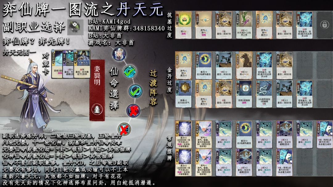 鸡哥副职业优选玩丹,其次玩命,玩法思路如下: 命理师姬方生的优点在于副职业卡牌有很强的生存能力,可以守进第二圈,进了第二圈补锻就能锻满,不然追求第一圈锻满放三张锻牌强锻基本上是必输的。金丹期有蓝跳可以缩短卡程,更好的锻体。化神成型卡组如图1,而且命运轮回这张牌是可以防七星阁的星奕断跳牌的,开了命运轮回可以保证断不到678卡位的牌,这是命运轮回的一大优势。 练气期的鸡哥可以说是蛆,开局几轮直接d