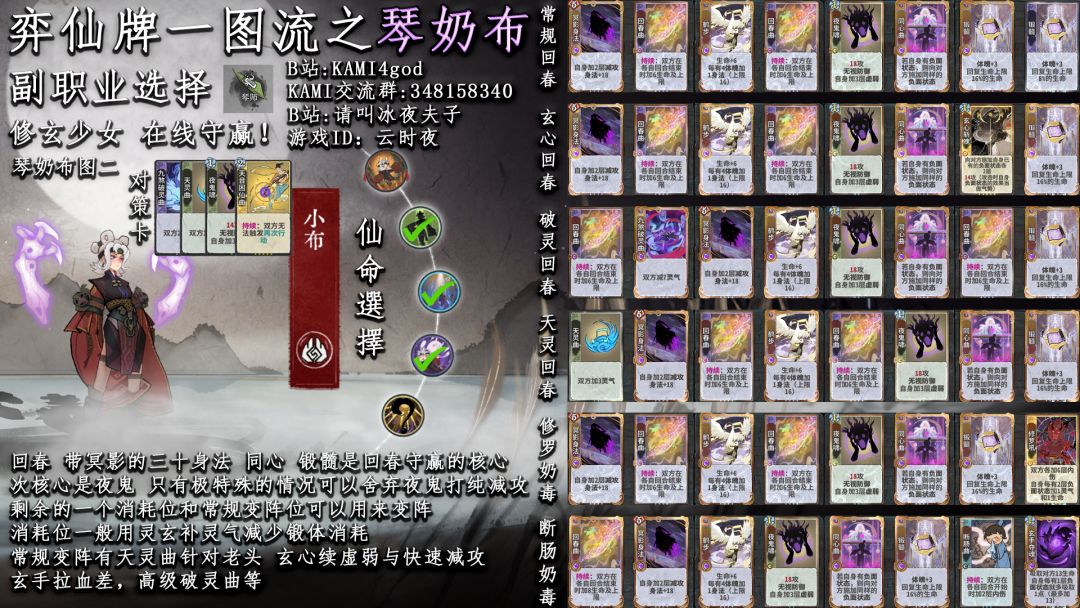 玩了大概10多把,尝试了各种路线 1.毒 2.奶 3.乱七八糟一大堆套路 现在奉上4动杀配卡 除了筑基仙命不要选本命,其他本命 配卡如下 1.鹤步 2.段髓 3.鹤步 4.元婴本命卡(也可以换段神 段髓,根据阵容来) 5.冥影身法 6.化神本命卡(也可以段神) 7.百杀 8.百杀 灵活调整吧,根据实际情况来
