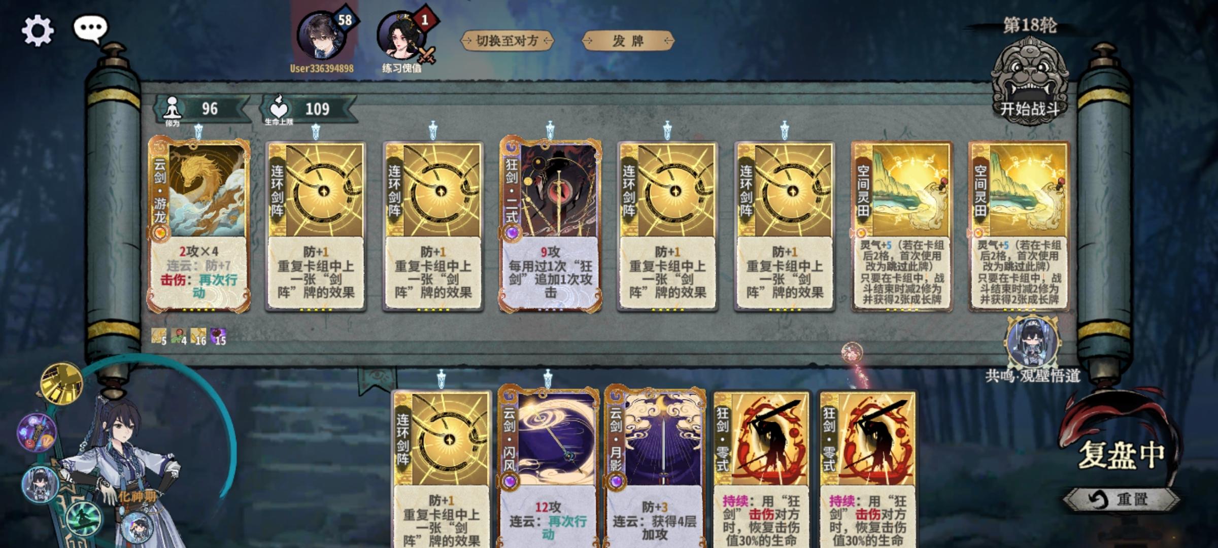 筑吉+攻,金蛋+剑意,元音+灵气,化肾选无极,刻印选剑意加4,另一个根据情况自行调配,筑基到金蛋,剑意飞牙过渡,到元婴D牌到流云,化神D剑意,御剑和连环作为辅助穿插使用,如果对面没有禁再次行动的牌就加,如果有就撤出来。一般情况三动杀,对面防多或者有护体四动杀。5+(4)+9=18,(18+2)×6=120,再加澄心20+,一共140+