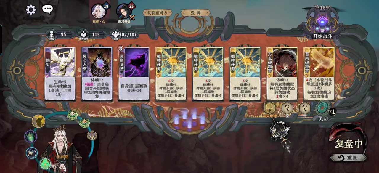 免费刷新刷到法天象地,直接18回合破百体了,实战打的时候是用的鹤步冥心冥影金书金书金书破魔掌百杀,复盘发现三动伤害就够了