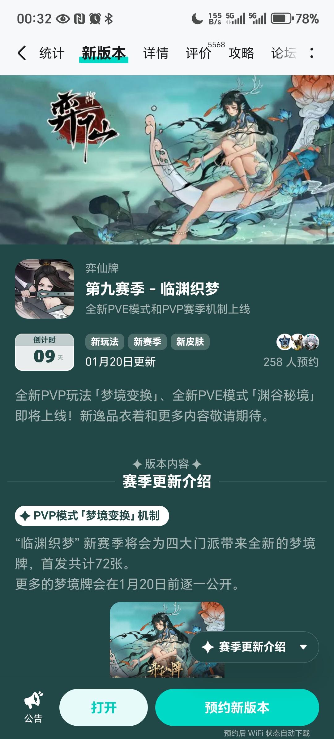 道友们好,《弈仙牌》全新赛季“临渊织梦”将于 1 月 20 日 11:00 开启!赛季宣传片正式公开:全新赛季机制“梦境”,带来 72 张梦境新牌全新单人 PVE 肉鸽爬塔模式“渊谷秘境”逸品衣着“龙瑶-御九霄”“弈闻录”功能优化,改为常驻模式主线剧情更新:“补天棘路”第八章沧海龙吟三重限时活动收获好礼:寒冬签到、沧海飞尘和珊瑚梦境《镖人》联动、更多梦境牌、PVE模式新内容和新皮肤