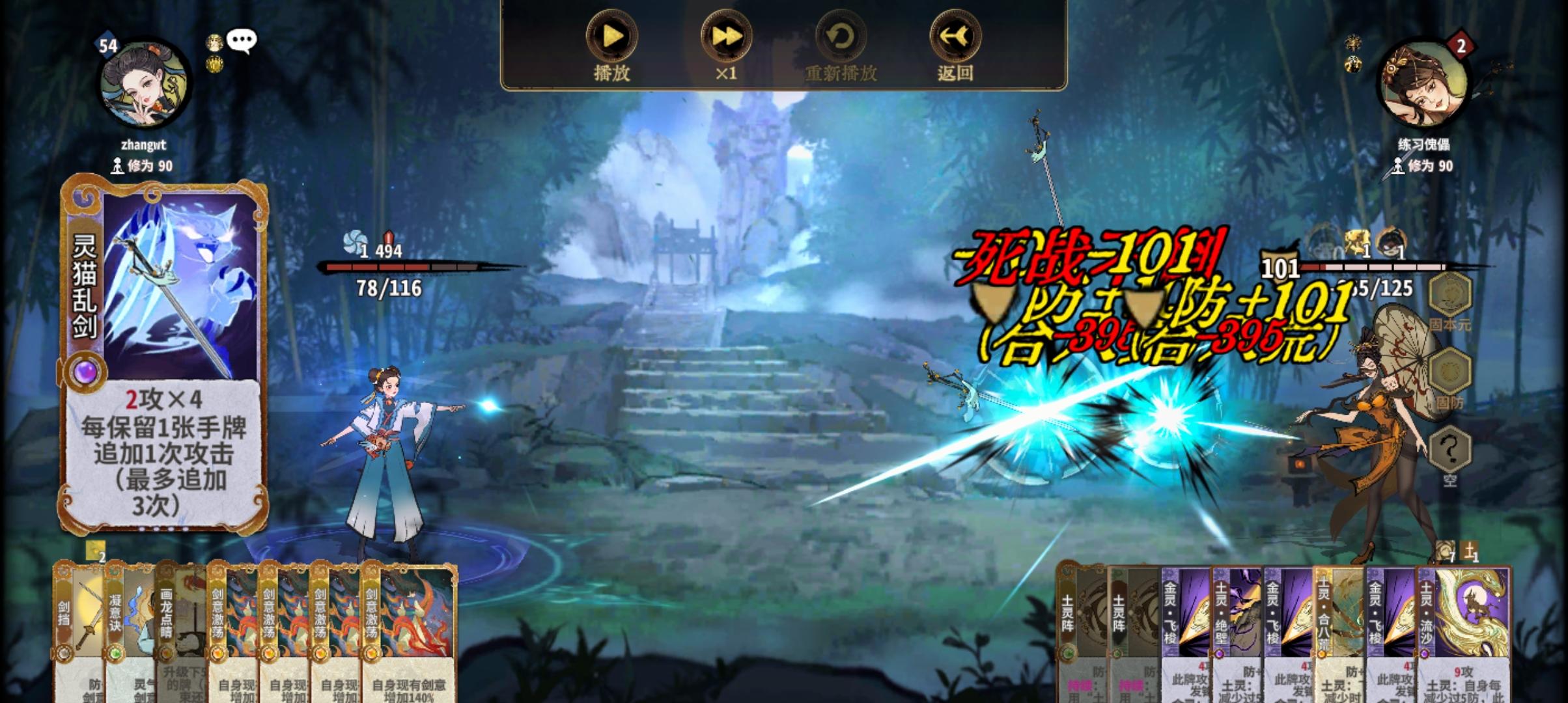 筑吉+攻,金蛋+剑意,元音+灵气,化肾选无极,刻印选剑意加4,另一个根据情况自行调配,筑基到金蛋,剑意飞牙过渡,到元婴D牌到流云,化神D剑意,御剑和连环作为辅助穿插使用,如果对面没有禁再次行动的牌就加,如果有就撤出来。一般情况三动杀,对面防多或者有护体四动杀。5+(4)+9=18,(18+2)×6=120,再加澄心20+,一共140+