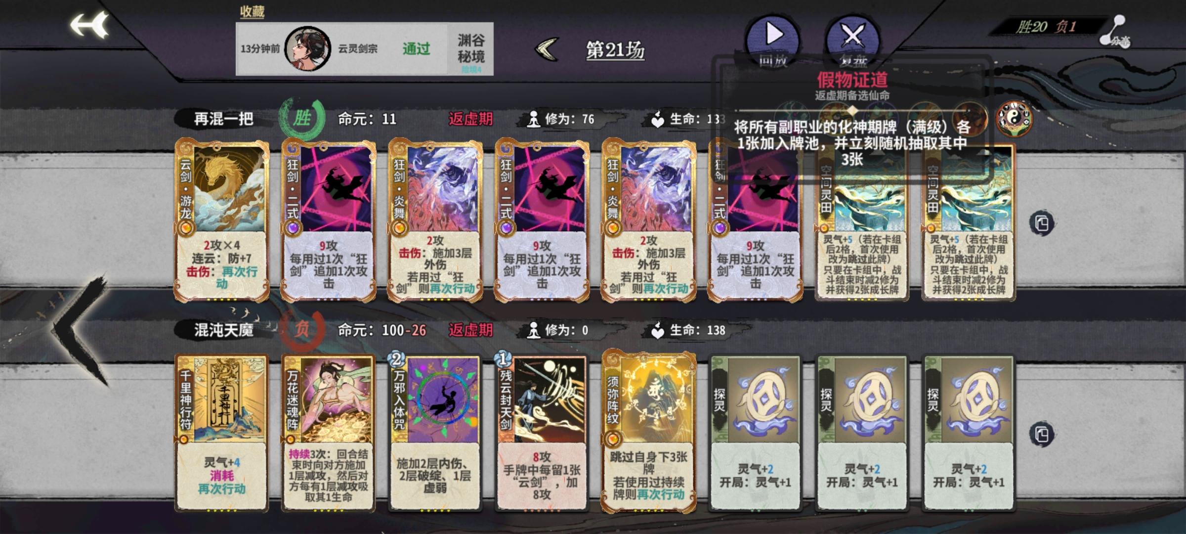 游戏昵称:流水无情叹落花UID:69608267438c9455b20e512b1.卡组特点:剑阵流派,攻防兼备,有效抵挡混沌天魔三动爆发2.核心仙命:金丹期龙鳞保命必拿,能平稳度过前期,有剑阵守护优先拿剑阵守护,在没有水月剑阵的情况下很好用3.核心卡牌:合势剑阵,由于合势剑阵的被动效果,当卡组中八张都为剑阵时,满级合势剑阵可打出高达39/39攻防,利用连环剑阵重复效果配合镜花剑阵收尾,在