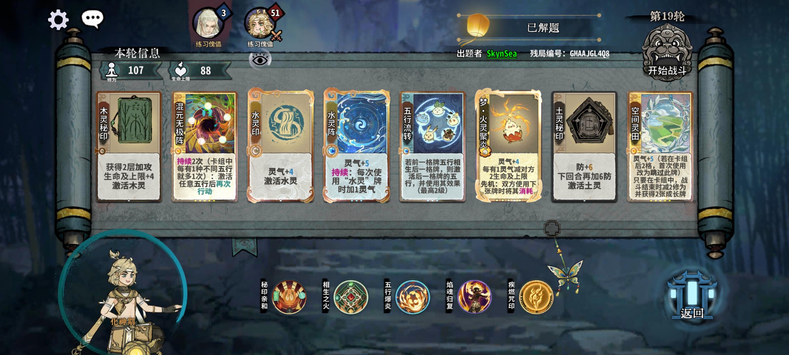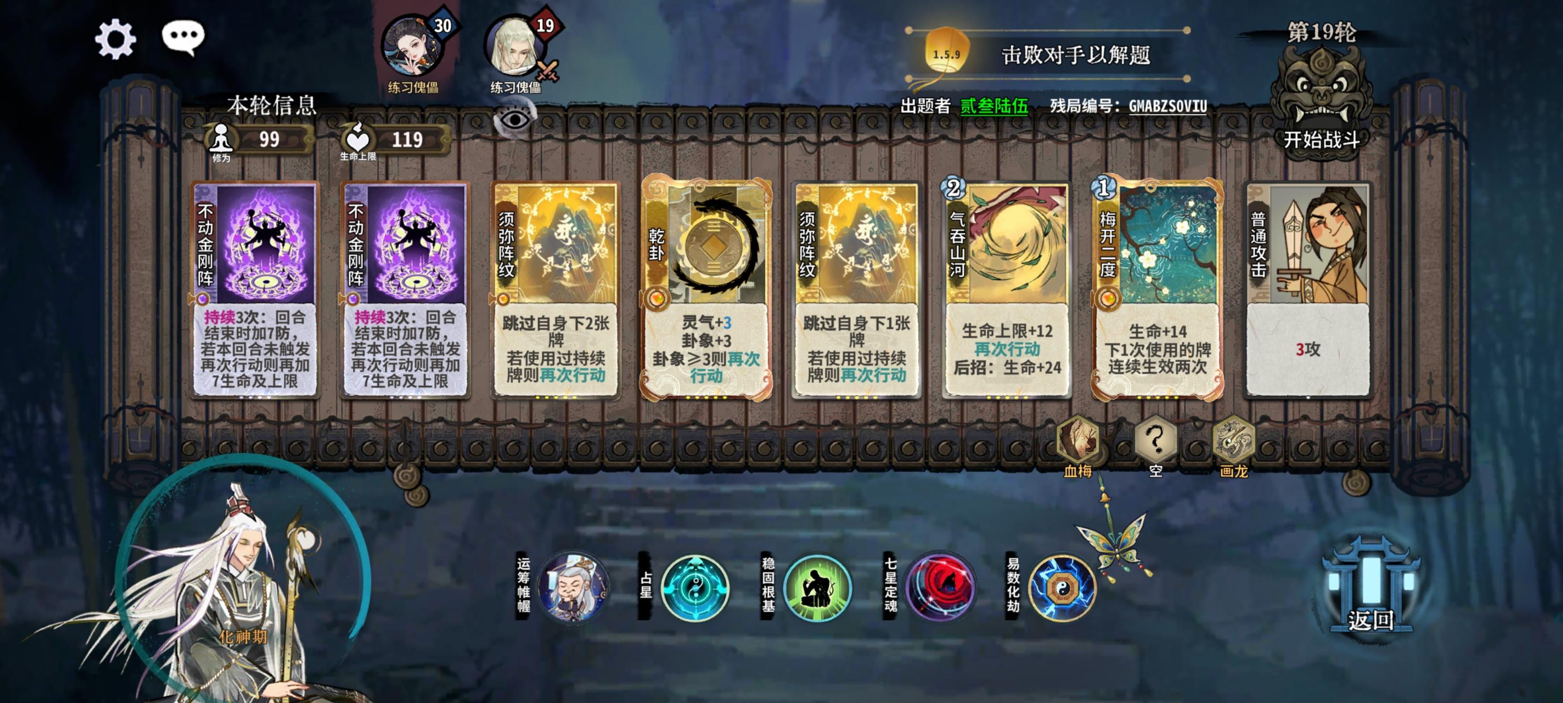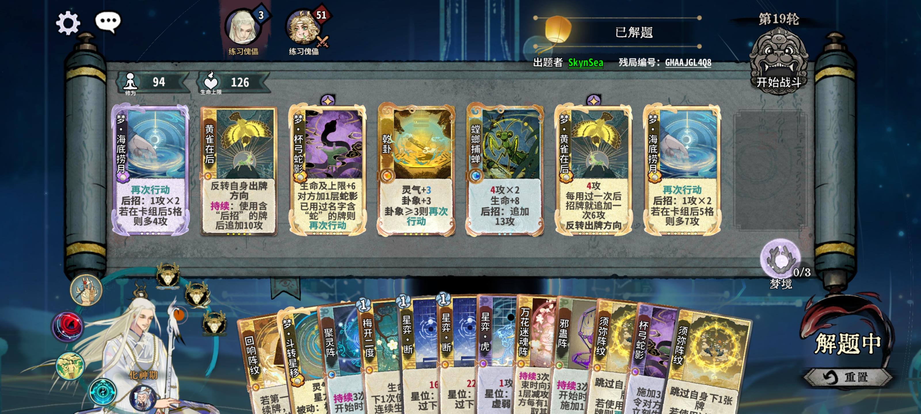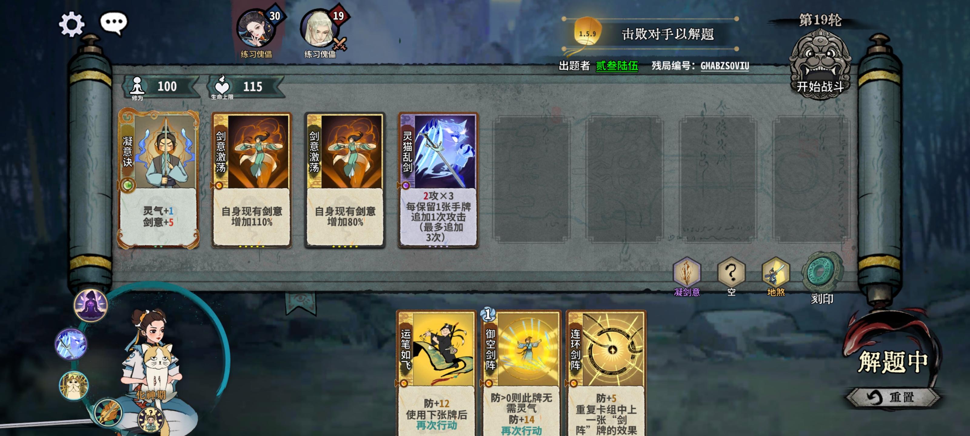 这是两个残局编号GMAAJGL4Q8GMABZS0VIU第一个给的牌好多好杂,他原本玩的内伤,我试了好久没过。后面尝试一下四图的无限定身,结果每次都倒在第四回合,差4滴血就可以启动了。后面改变思路玩后发制人,试了几下过了,最后就剩2血,感觉在玩门派解密,每次都剩一血过,不知道还有其他解法没。第二剑意我也是想好久,第四回合直接被定,第三回合又打不死,百思不得其解,后来想到先手问题,看了一下攻略,