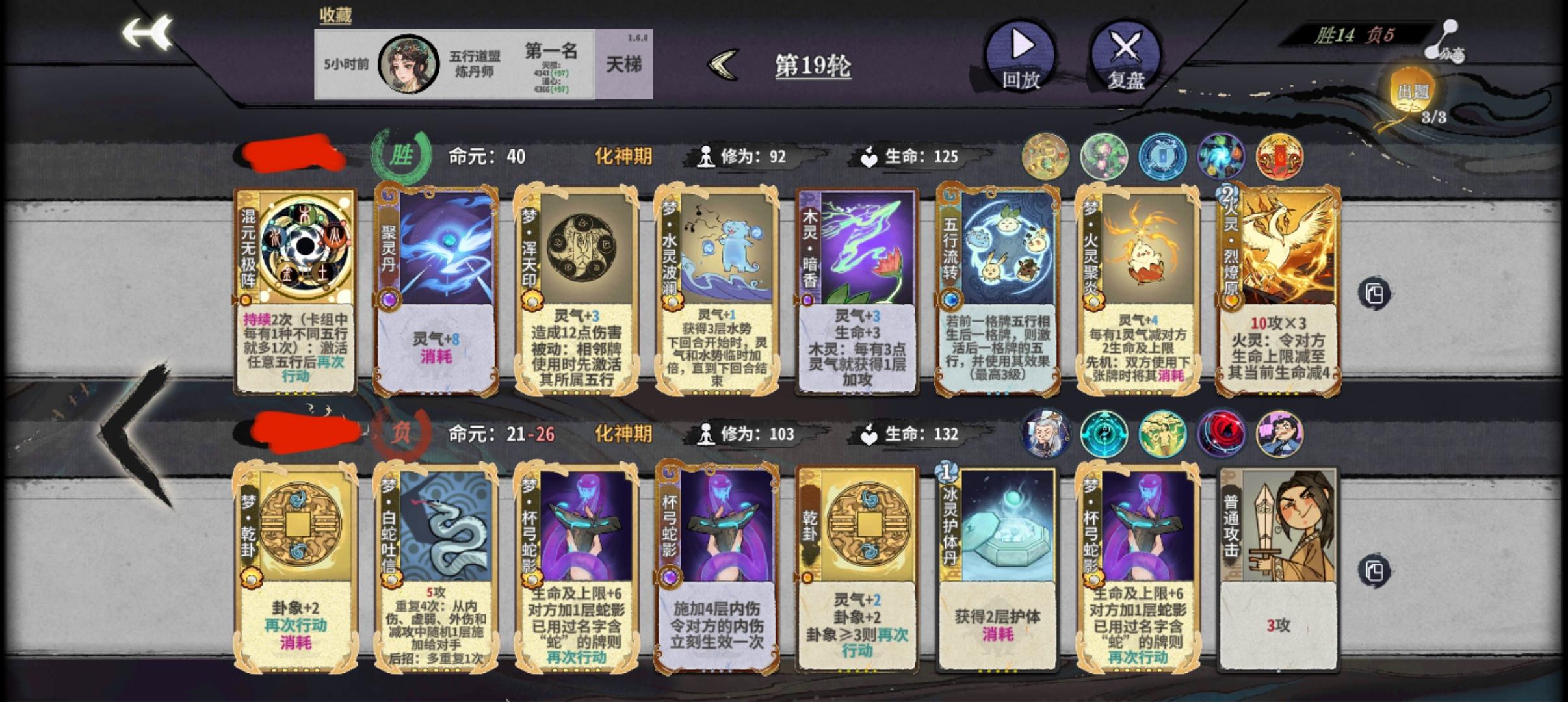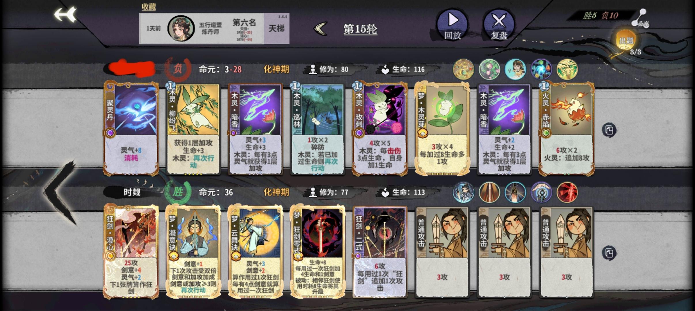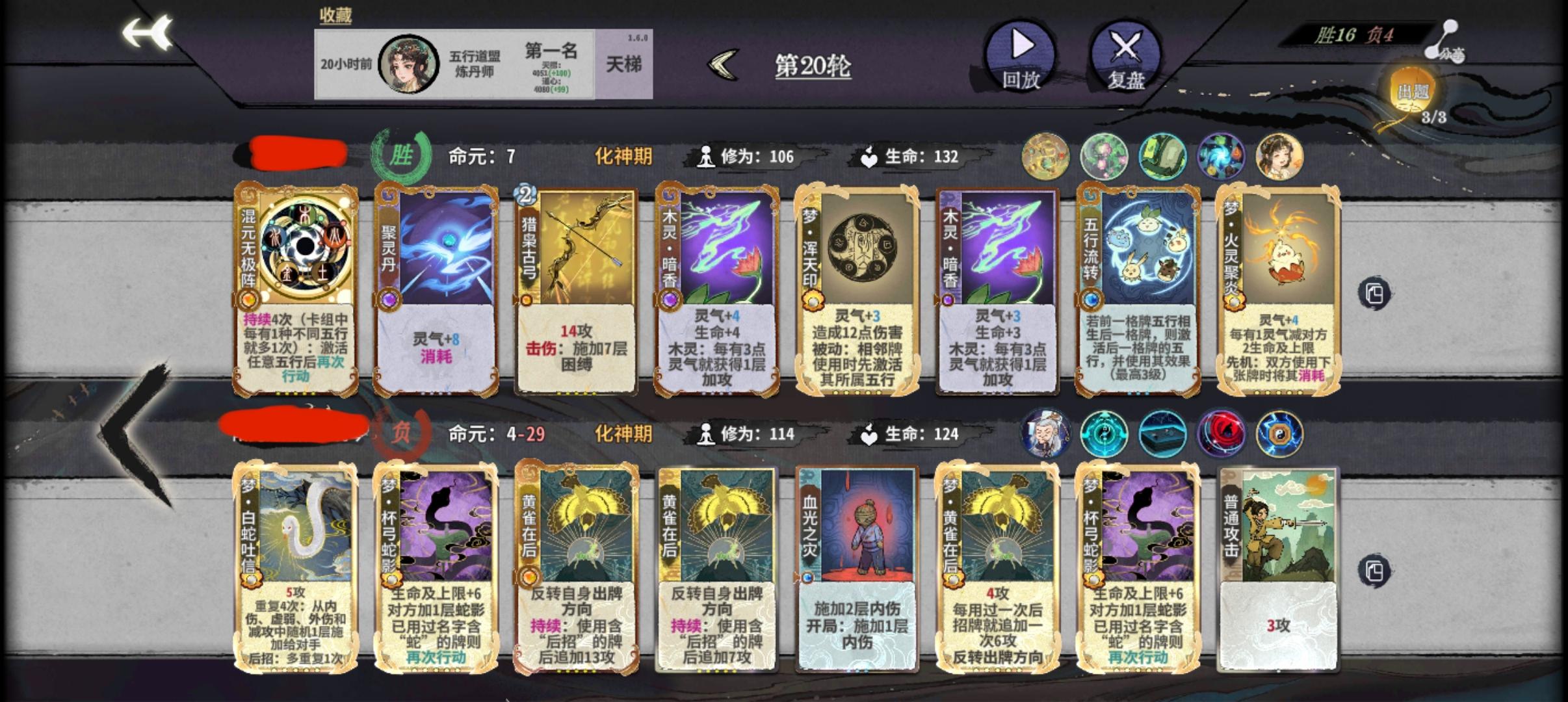 花了两个晚上,打通了难度15的天魔,分享一下经验,先讲讲我遇到过的天魔。 第一类 纯输出出现概率最高,也是最容易翻车的阵容。第二套的无尽崩绝,随机到闪击以后2动的斩杀线高达200+。第三套龙提供的两层护体,也会给很多万法套路带来阻碍。 第二类 带防御五动杀这类会给绝大多数的三动杀阵容带来麻烦,但解决起来并不困难,只要躲开虚弱即可。 15难度下的天魔拥有182血,角