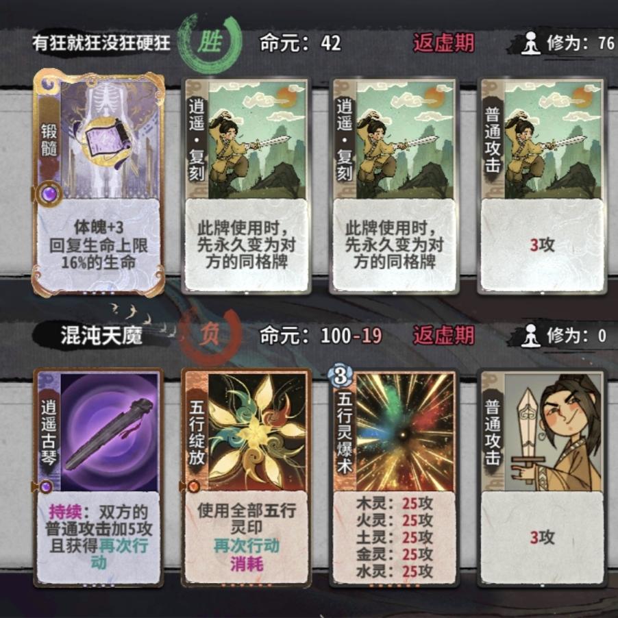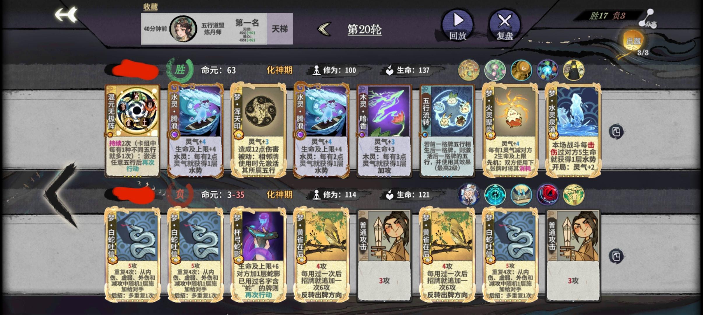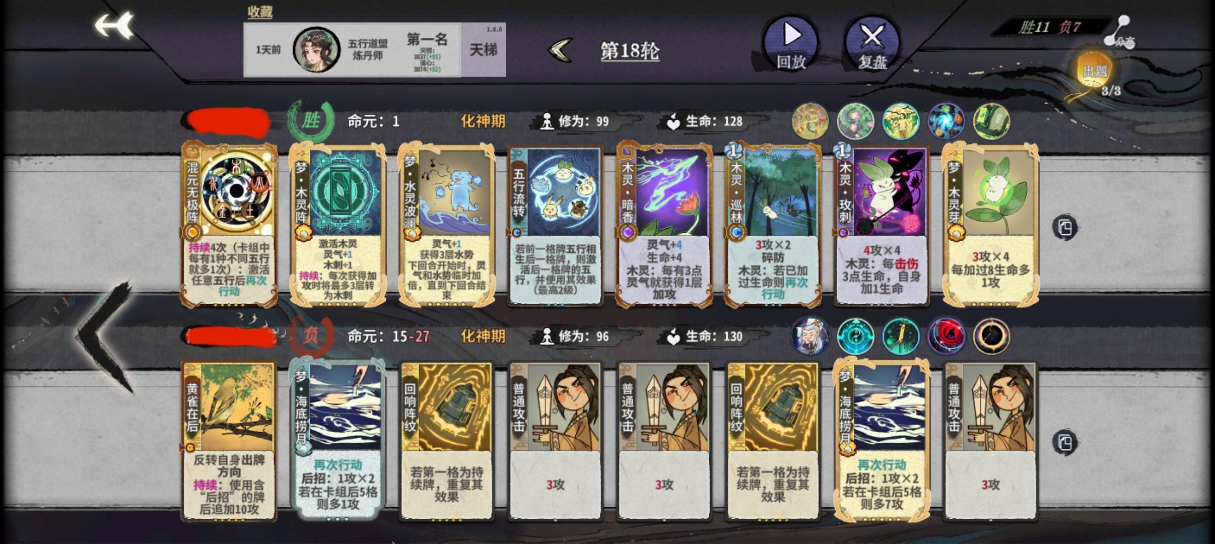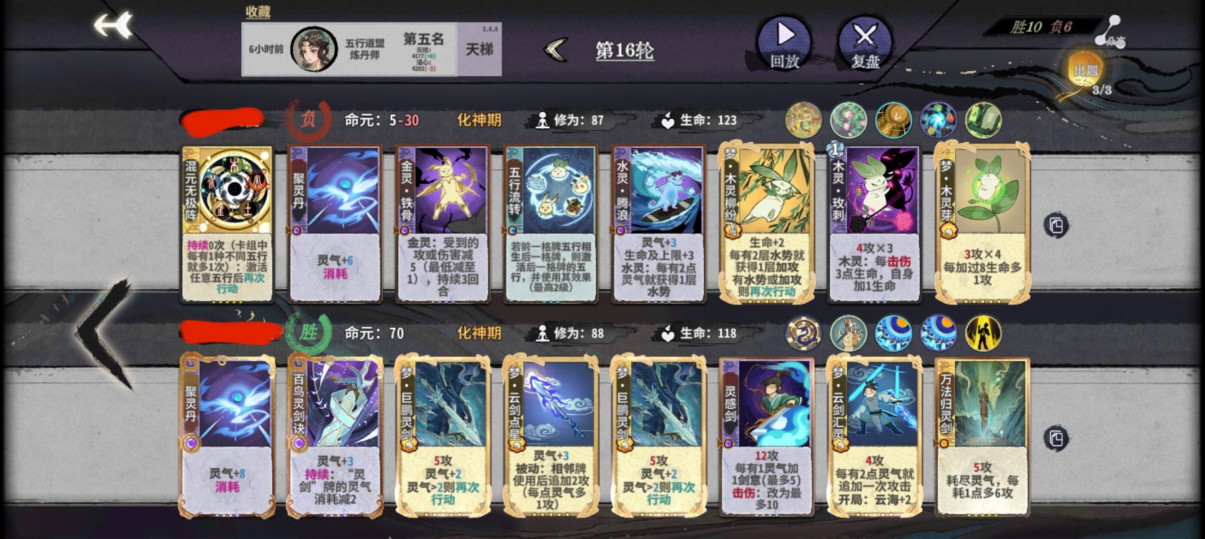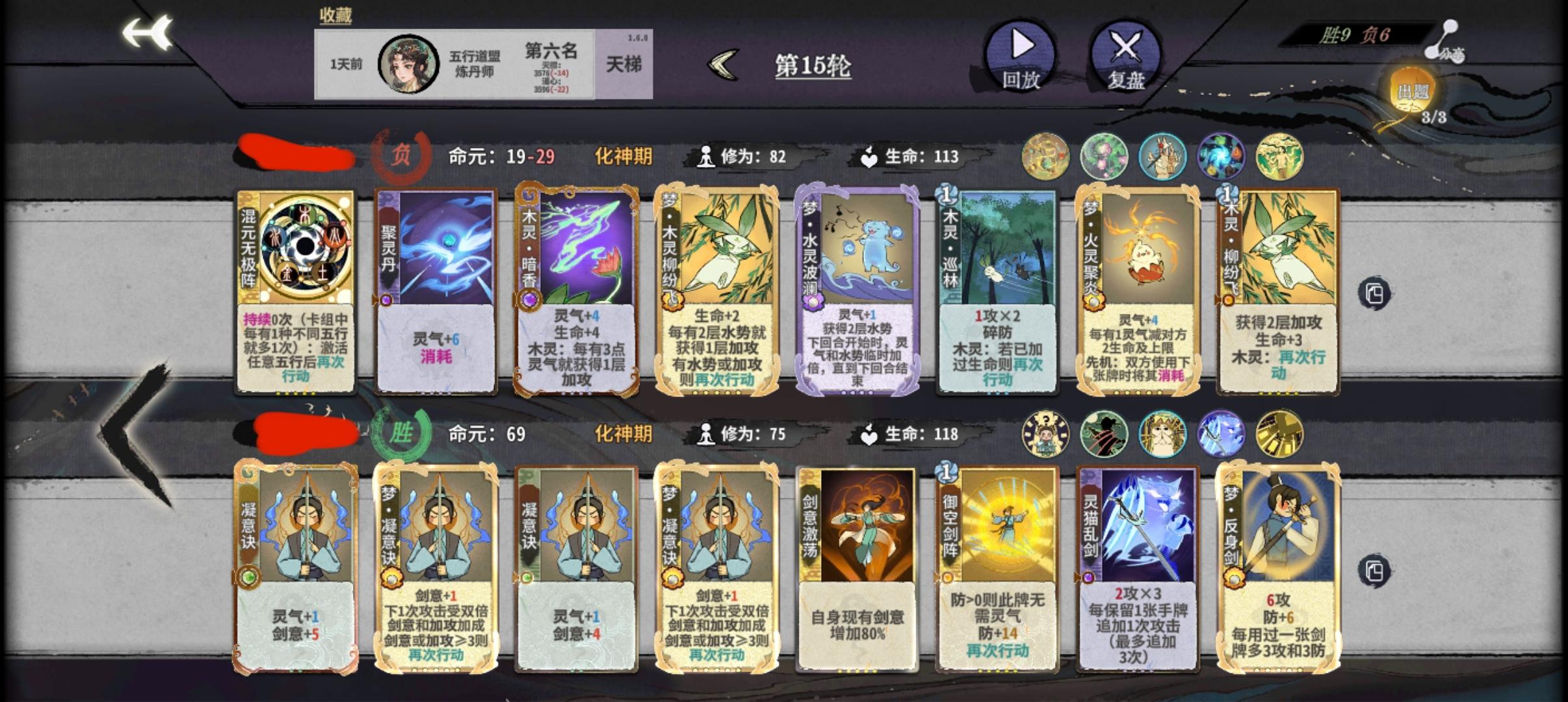 每次掉分都是输给剑意。每次第一都是决赛七星阁(还是在出聚炎的情况下,没聚炎根本无法第一,七星阁上一堆负面buff根本打不动)。而决赛一次见不到五行道盟。这说明七星阁和云灵剑宗已超模,而五行道盟虽然一定程度上克制七星阁,但终归是下水道,只能让七星阁充当打手开路。七星阁目前玩后招和蛇的特别多,比较偏娱乐,恰好打不过聚炎,如果不是为了娱乐而是为了取胜,依旧可以换套路碾压五行道盟。剑宗牌是这样的。