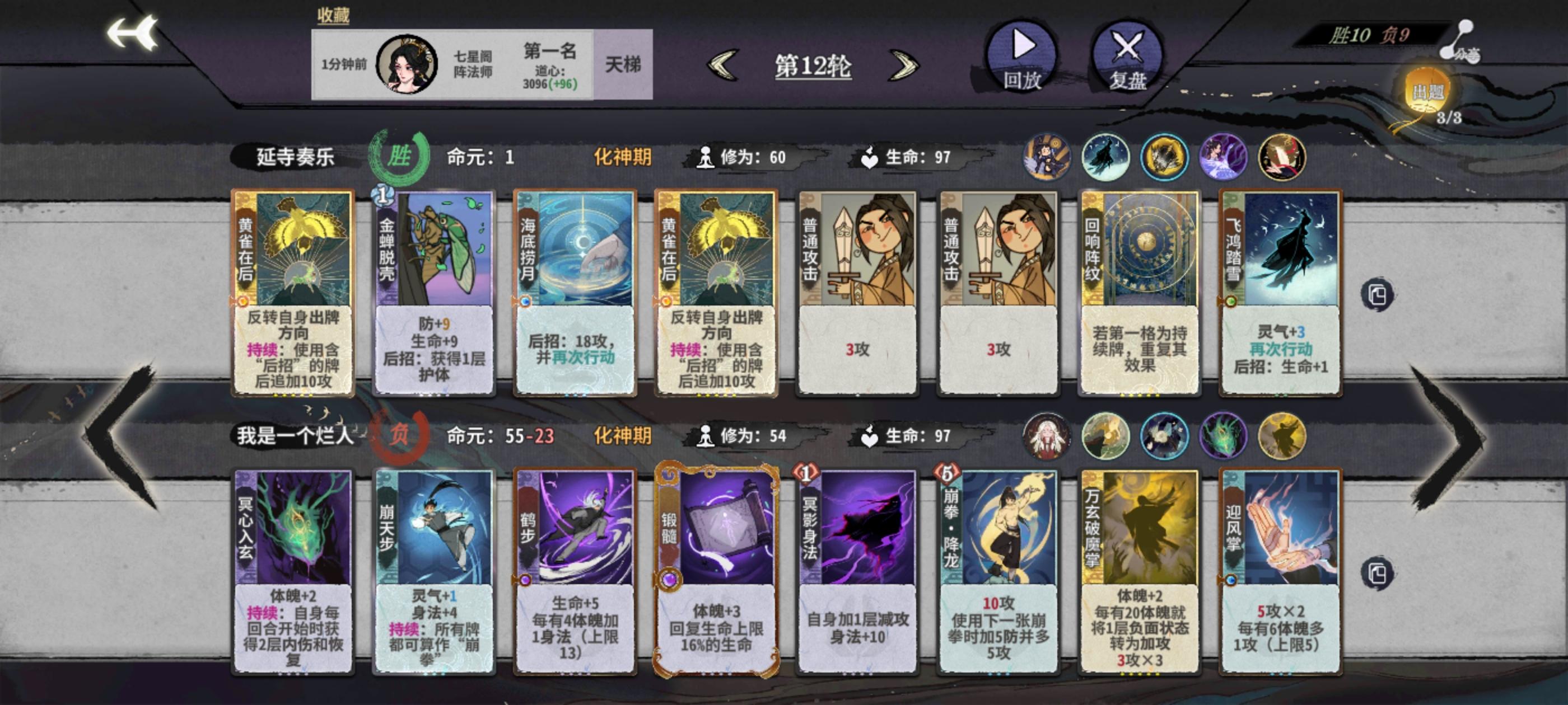 起因是做个任务要加20血,我常玩的琴瑶和画老头都没有啥加血牌,于是我就想到玩一把阵雁,由于我只知道成型是啥样,而不知道过渡,所以我直接连败过渡,12轮一波成型直接四张黄雀,最后爽吃,运麻了