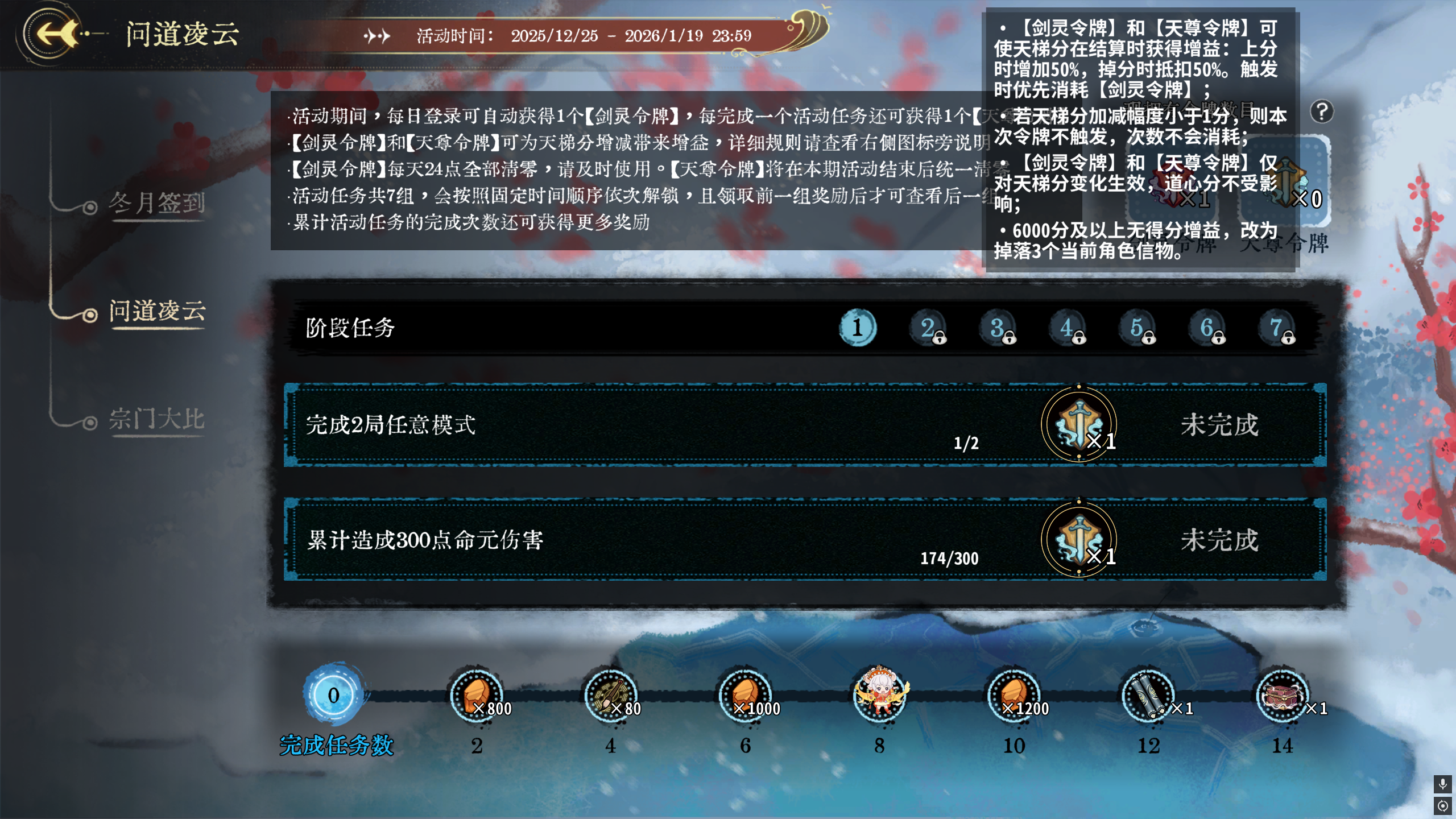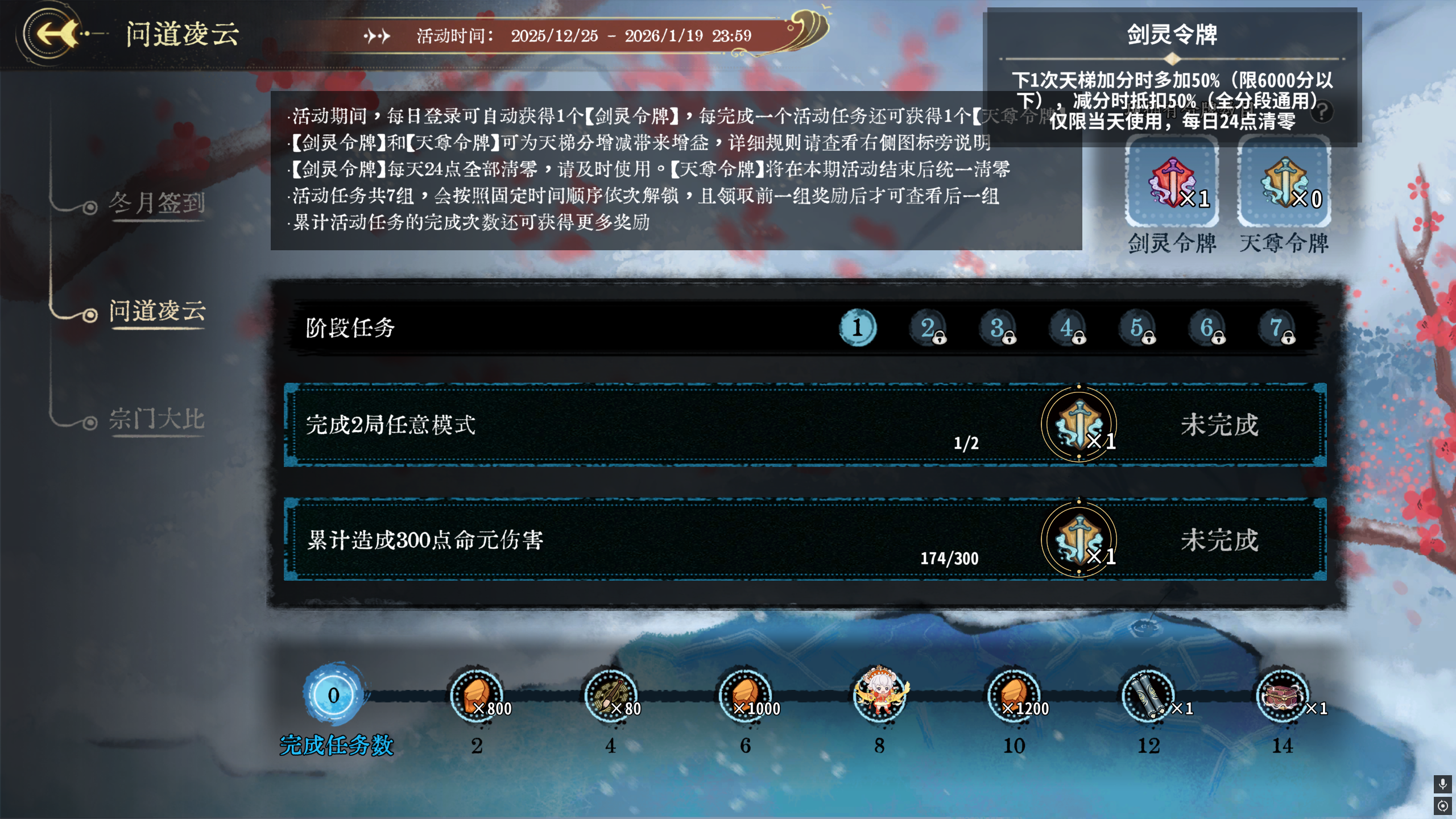 道友们好,新活动「问道凌云」、「快速模式-宗门大比」即将会在12月25日14:00更新后限时开启!全新衣着「曜灵-金仓纳福」和卡牌样式组合包也会在更新后同步上架。新一期三洲令将会在12月26日开启。更新日志问道凌云活动期间每日签到以及完成任务即可获得灵石、彩墨绘卷、画境秘匣等奖励。活动期间还可获得“剑灵令牌”和“天尊令牌”。每个令牌可令1次天梯结算加分时多加50%(限6000分以下)