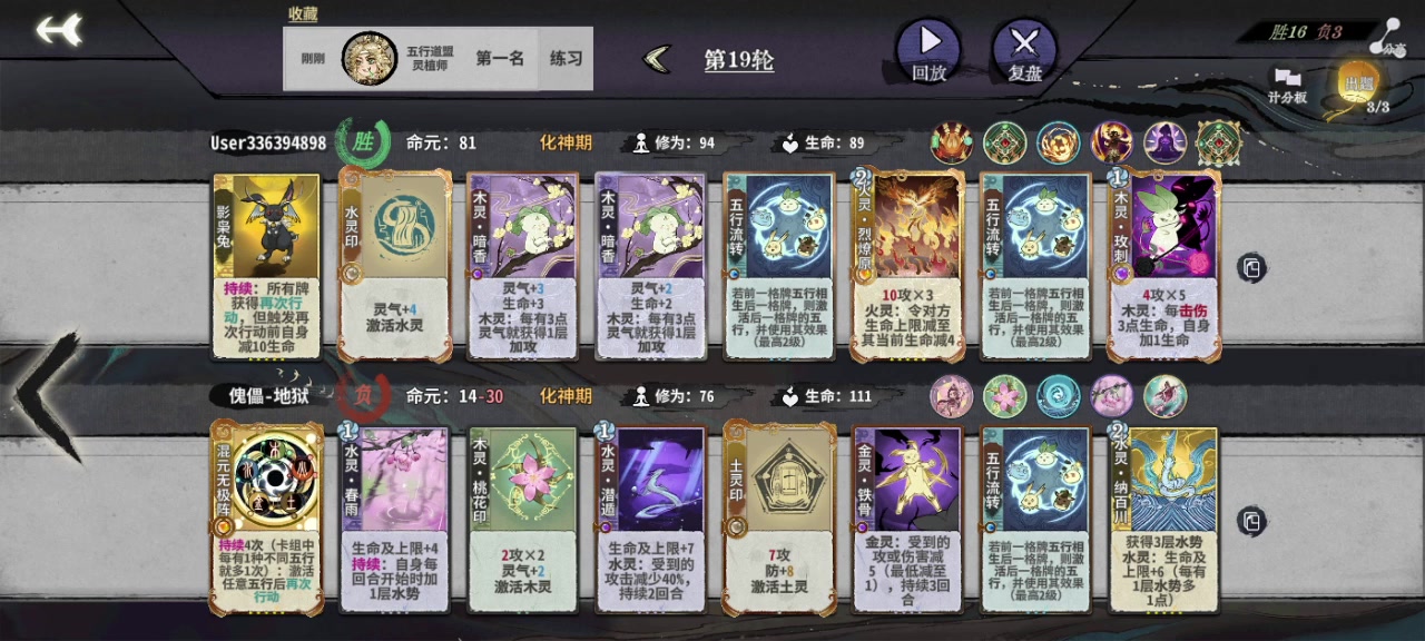 为了让新入坑的萌新能快速上手阵雁,接下来我将会以我本赛季晋升万分的阵雁吃鸡局作为示例分享我的过渡思路。战绩代码:gmabmbdet5对局阵容:花沁蕊 龙瑶 杜怜鸳 姜袭明 谭舒雁 屠奎 谭舒雁 谭舒雁(我)第1轮:不d,上数值高的卡,尽量凑齐一圈20数值。刻印选择高数值刻印,这里选择霹雳刻印配合掌心雷可以在第二圈吃够四点数值,是练气刻印的标准数值。第2轮:空牌上本,优先留数值高的卡,有夹为最