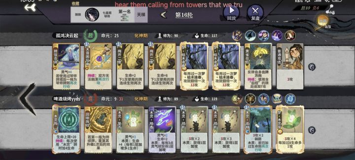 还是梦卡的问题。很多人说七星阁强,七星阁确实强,但是梦两仪没有梦落花和枯木,梦枯木是只有一张的,而最多情况是梦两仪能落花梦枯木这些一张都没有,都是什么梦落雷梦斗转。我这把的牌放上赛季百分之百吃分,很有概率吃鸡,但是放这个赛季连前四都进不了。我上赛季一个月从人仙打到金仙,这赛季打了一个月,比上赛季打的还勤奋,结果一分没上。