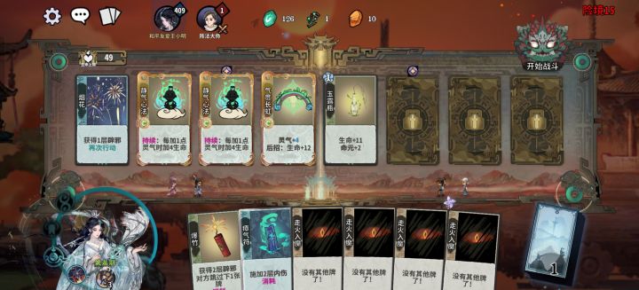 玉露瓶,爽爽爽!开局第一层拿到了慈念曲和玉露瓶,开始无脑刷刷刷。后面第三层选天命的时候出了“每有150天机石就有1层护体”(主要另外三个也不咋样)。到了第四层的随机事件,是用命元换牌/天机石/钥匙,换了一堆天机石。于是开局就有17层护体。在和小黑子的最后决战里面(手上已经握着大把牌了,前