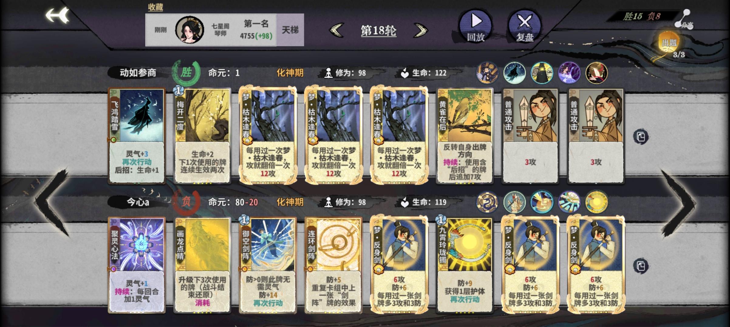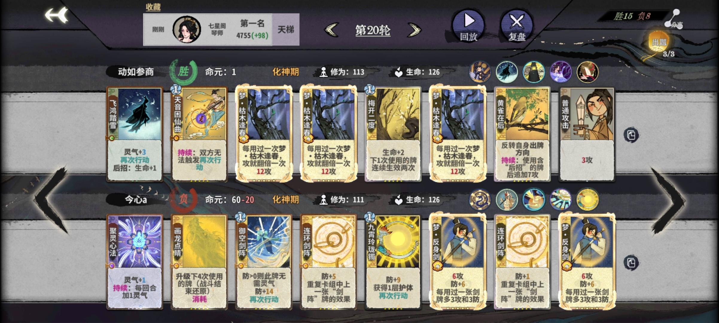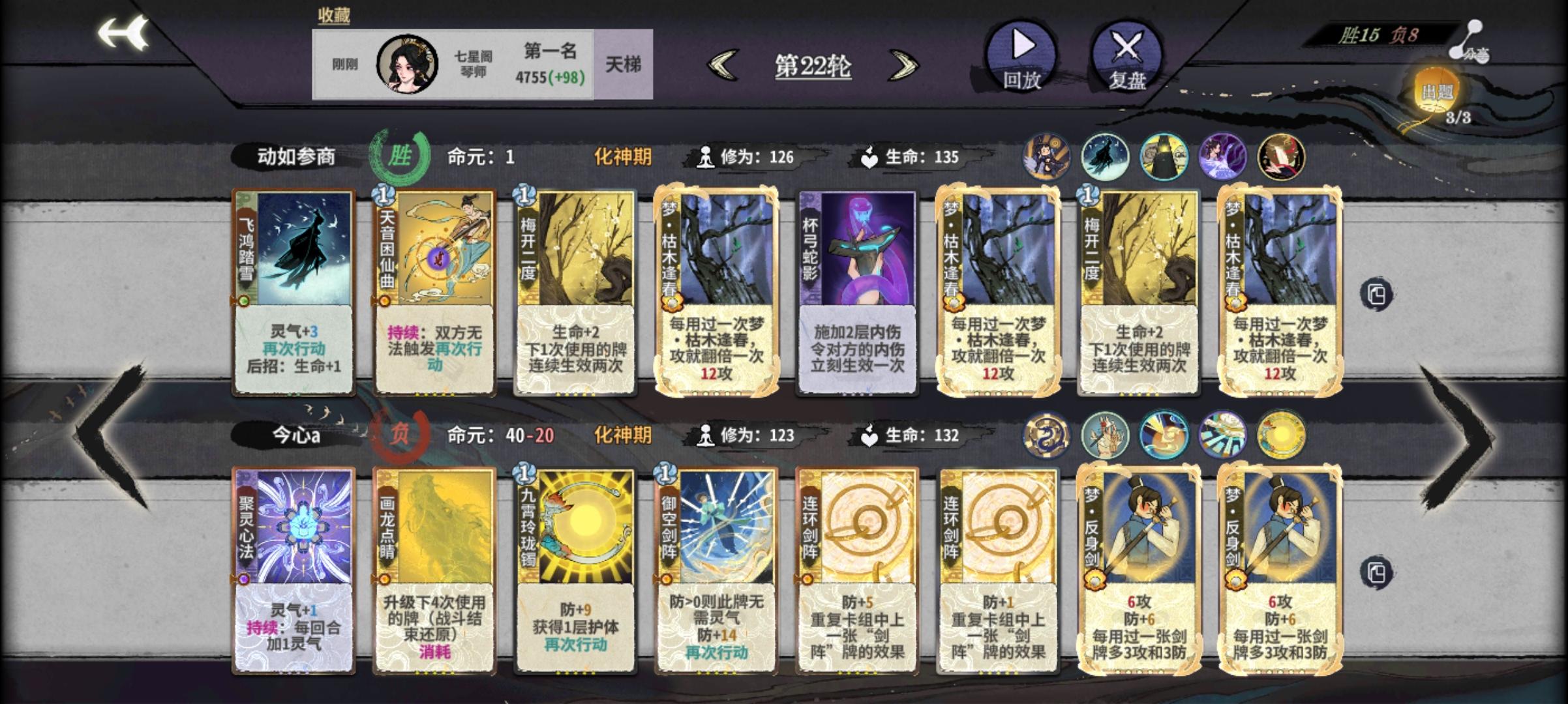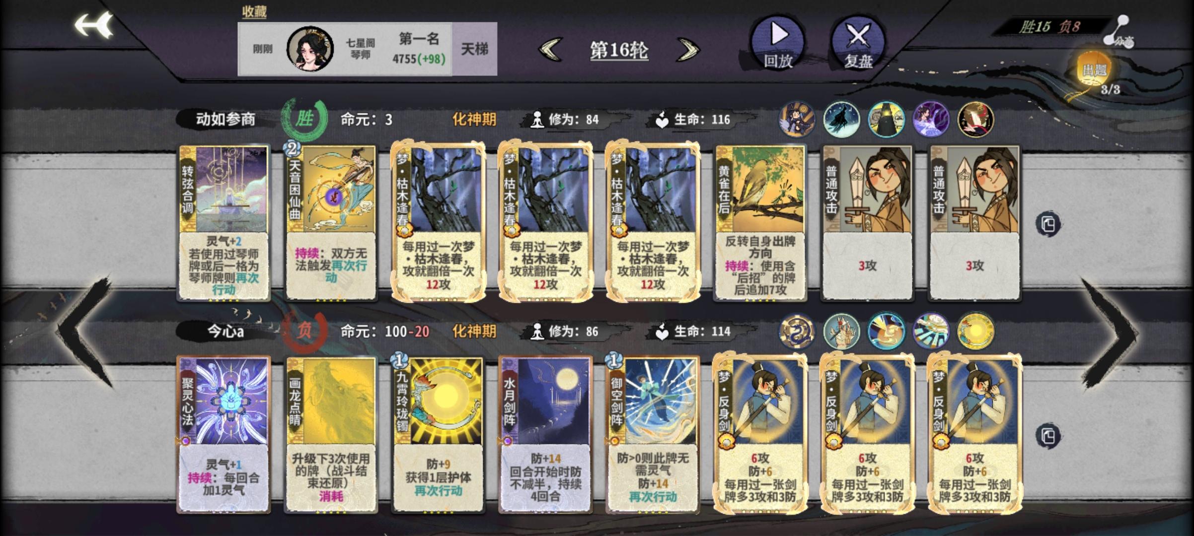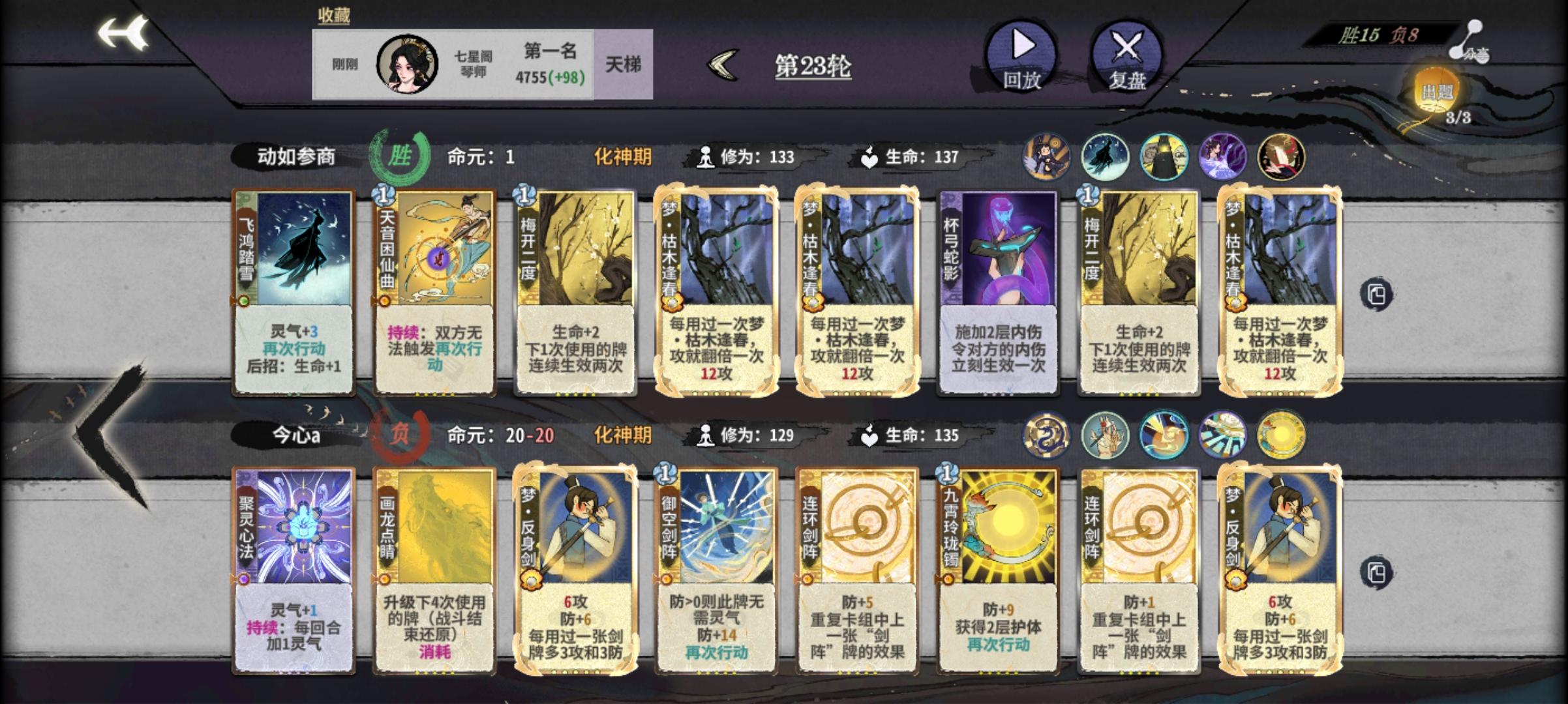 大家好我是新版本榜一南宫樱灵殿の懒惰虫UID:65b177b6f54766ac19c0a00f喜欢玩剑意爆发速杀的小伙伴们你们好我是丹南宫,我已50把内光速6200+分,你也来试试吧!前言由于本版本核心为梦牌,本攻略将给出金木水火土混元碎击和各种混搭的思路。攻略将分为金木水火土五个大板块,然后给出点评。攻略可能较长,请耐心观看。先给出南宫的所有成型卡牌,可能比较长不要怕,后面会进行逐一