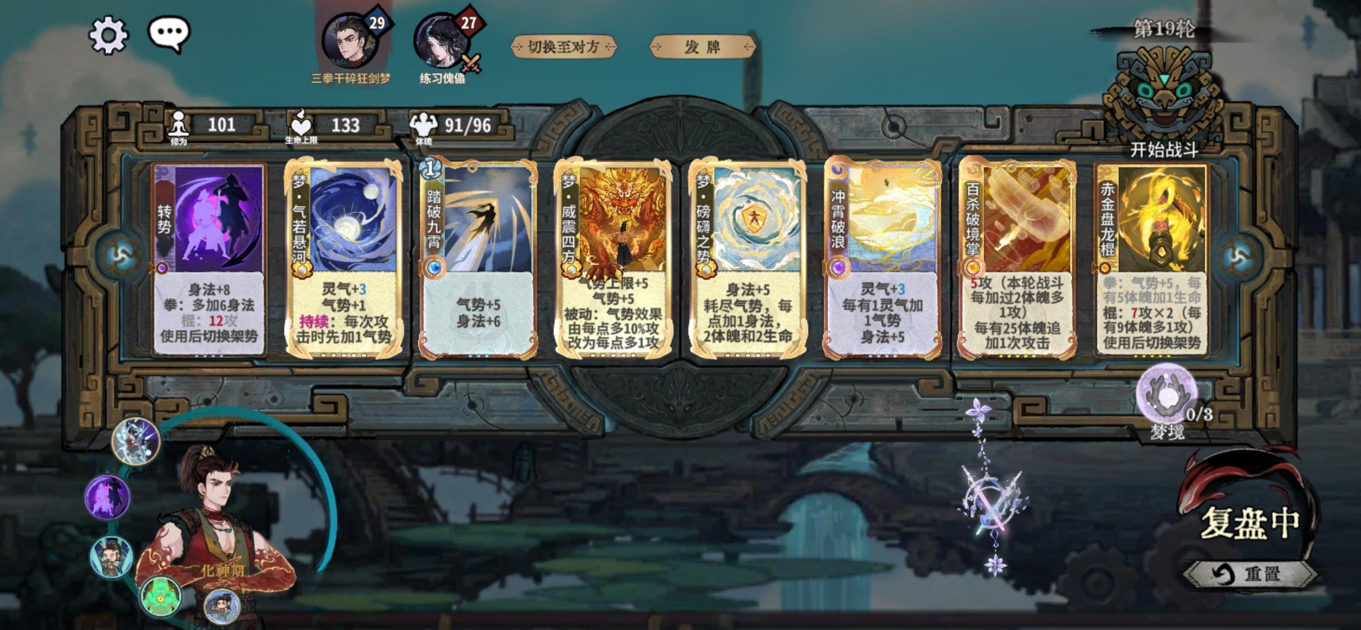 新赛季,回归玩玩,科研了一下理论上来说,这套锻玄宗通用,把转势换成冥影身法,盘龙棍随便换。不过李四水被动加灵气,冲霄能多回几点气势加伤害。副职随意,我一般玩丹。目前感觉不错。缺点是三张梦牌都是核心有点难抽。等我再体验几天再看看