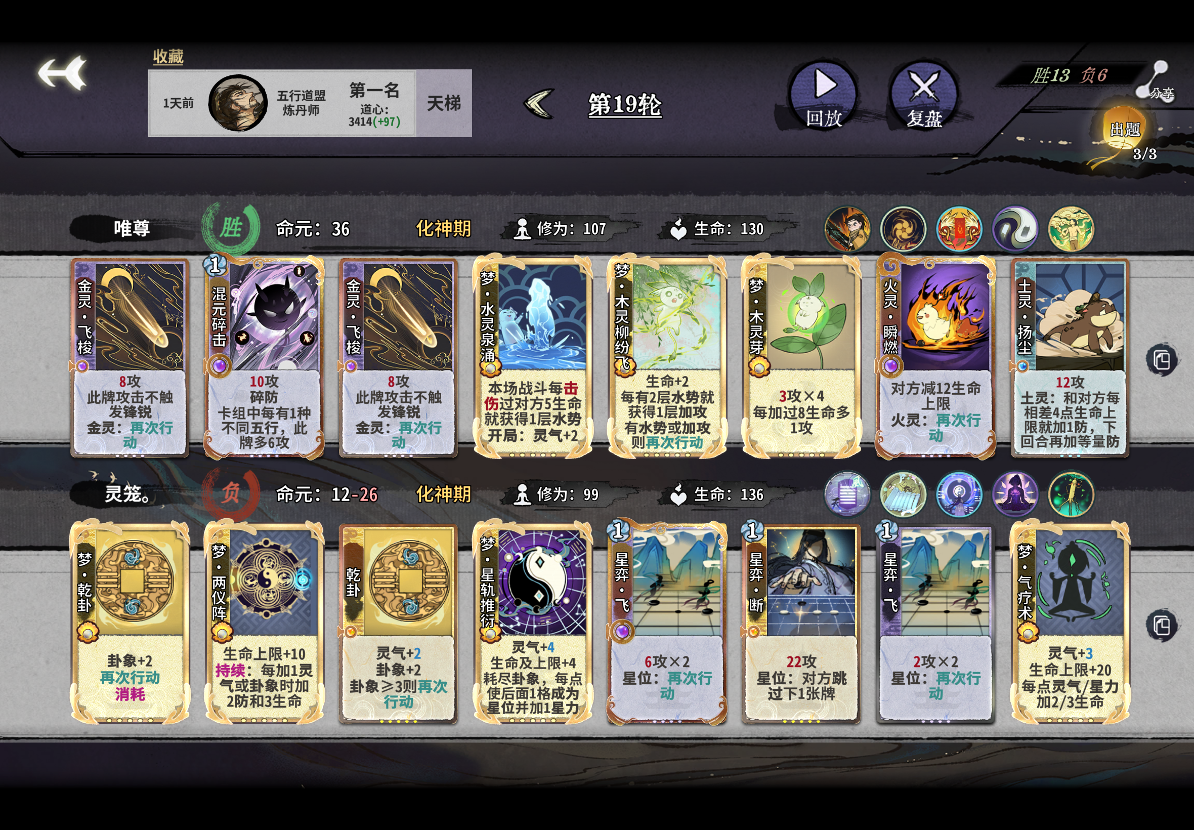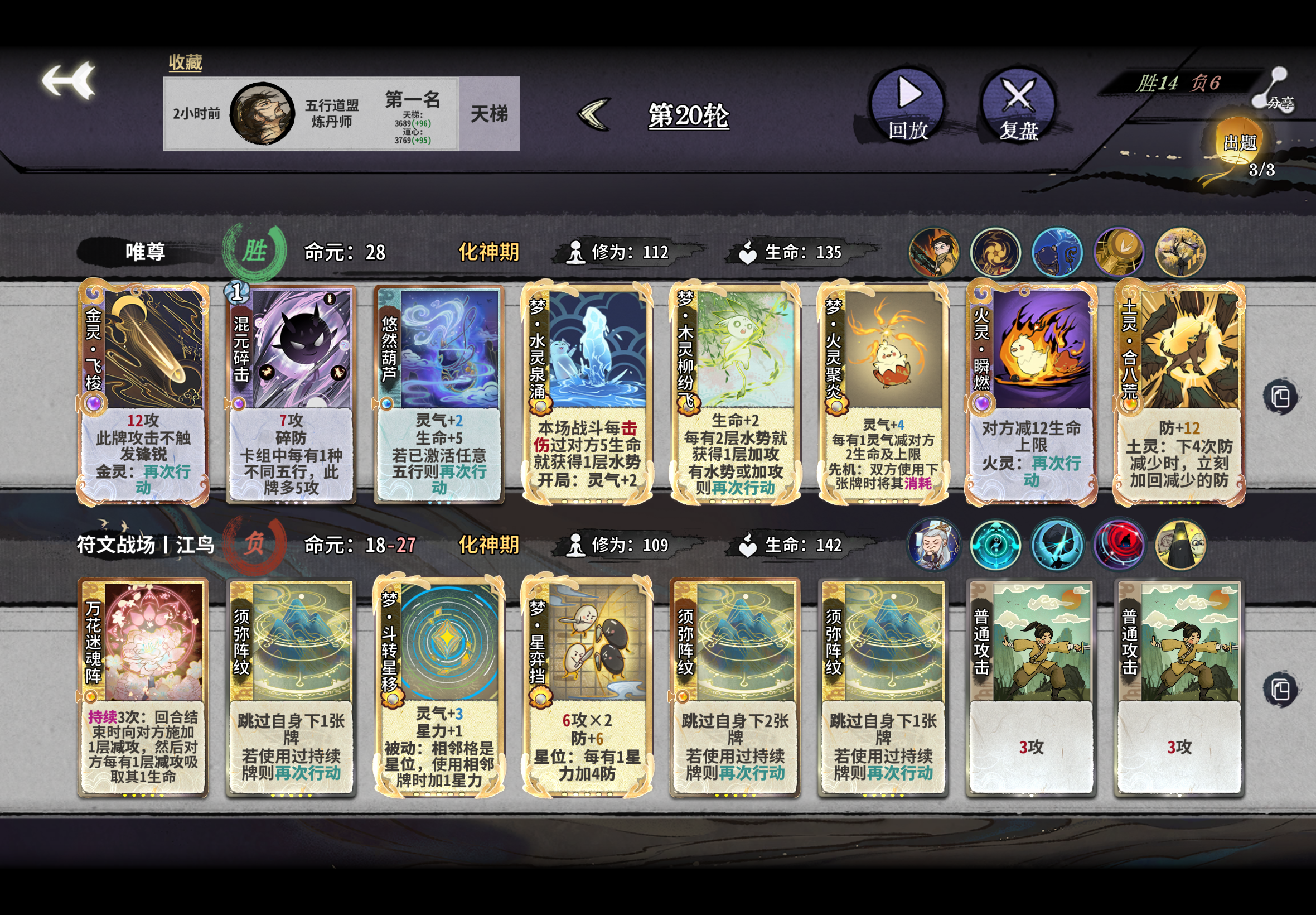 花了两个晚上,打通了难度15的天魔,分享一下经验,先讲讲我遇到过的天魔。 第一类 纯输出出现概率最高,也是最容易翻车的阵容。第二套的无尽崩绝,随机到闪击以后2动的斩杀线高达200+。第三套龙提供的两层护体,也会给很多万法套路带来阻碍。 第二类 带防御五动杀这类会给绝大多数的三动杀阵容带来麻烦,但解决起来并不困难,只要躲开虚弱即可。 15难度下的天魔拥有182血,角