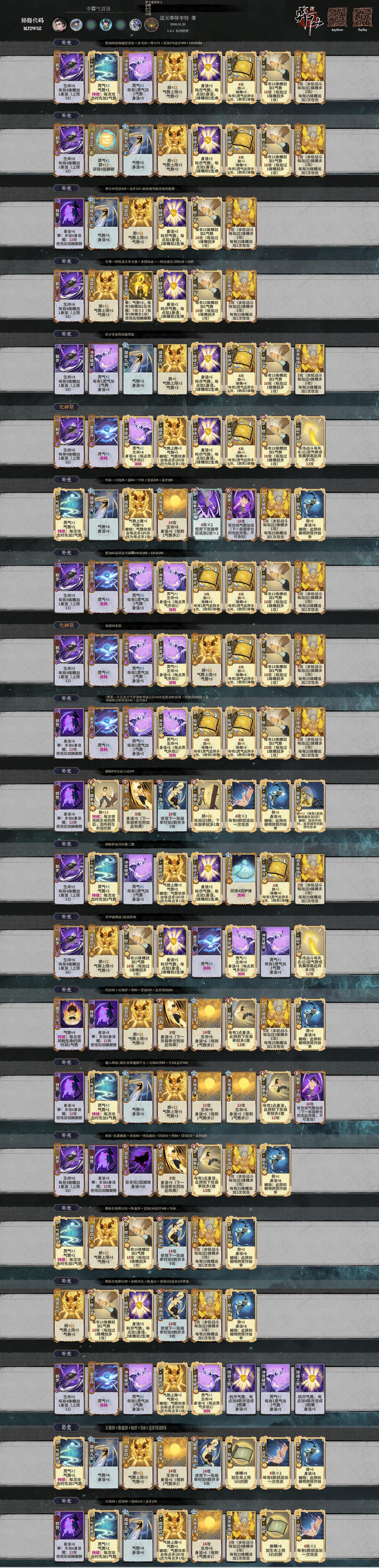 大家好我是新版本榜一南宫樱灵殿の懒惰虫UID:65b177b6f54766ac19c0a00f喜欢玩剑意爆发速杀的小伙伴们你们好我是丹南宫,我已50把内光速6200+分,你也来试试吧!前言由于本版本核心为梦牌,本攻略将给出金木水火土混元碎击和各种混搭的思路。攻略将分为金木水火土五个大板块,然后给出点评。攻略可能较长,请耐心观看。先给出南宫的所有成型卡牌,可能比较长不要怕,后面会进行逐一