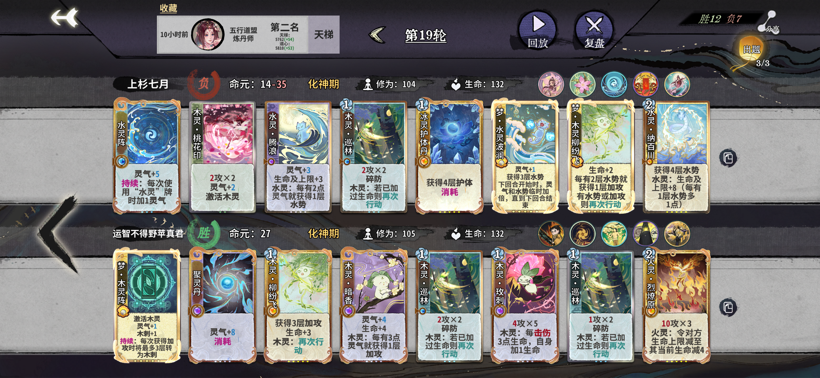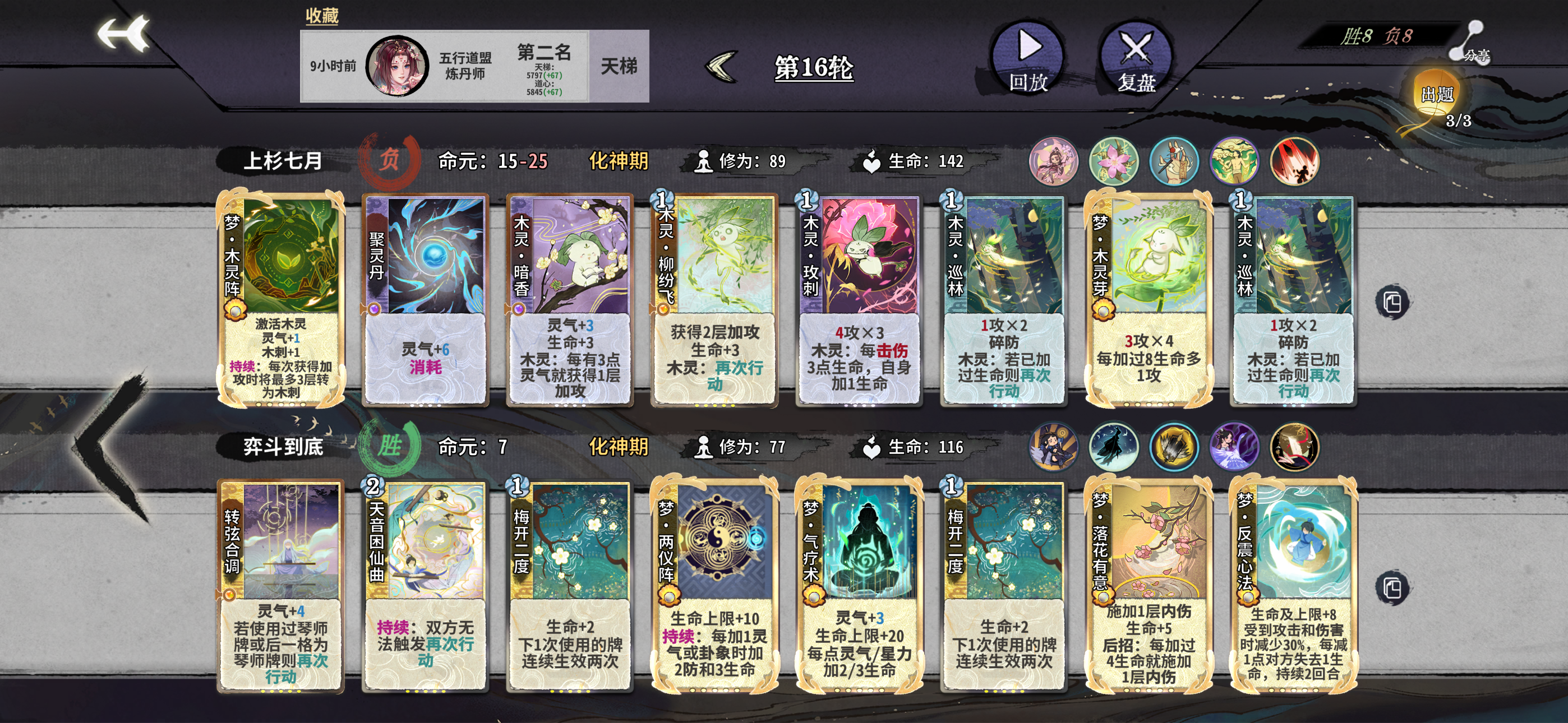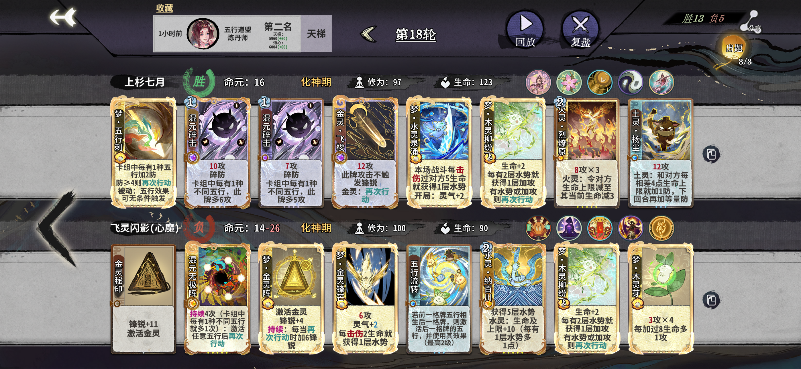 1.前言大家好,我是菜鸟玩家红尘有影,上个赛季吾行之道心榜排名第三,非常喜欢五行道盟的角色,经常研究各种五行角色的套路和卡组。因织梦赛季外面七星阁和剑宗肆虐,小弟在天梯被打得道心破碎,先有老鼠大人修为快如一匹马,小弟望尘莫及被一脚踢死,后有各种剑宗大人,剑意几刀砍小弟宛如砍瓜切菜,甚至还有七星阁各种仙女老登,小弟拼经全力也无法战胜,每当小弟卡组成形的时候,一首天音困仙区,天涯何处觅知音,小弟无奈