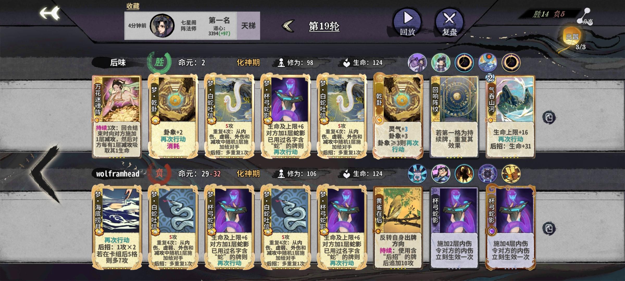 1.前言大家好,我是菜鸟玩家红尘有影,上个赛季吾行之道心榜排名第三,非常喜欢五行道盟的角色,经常研究各种五行角色的套路和卡组。因织梦赛季外面七星阁和剑宗肆虐,小弟在天梯被打得道心破碎,先有老鼠大人修为快如一匹马,小弟望尘莫及被一脚踢死,后有各种剑宗大人,剑意几刀砍小弟宛如砍瓜切菜,甚至还有七星阁各种仙女老登,小弟拼经全力也无法战胜,每当小弟卡组成形的时候,一首天音困仙区,天涯何处觅知音,小弟无奈