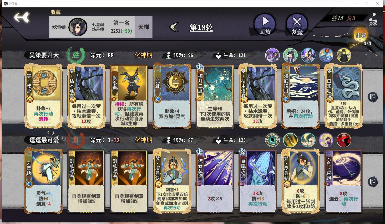 我花的赔钱指数在梦卡赛季达到了新高分享一下自救指南整体的混分思路就是化神之前尽可能提升质量,在第12轮之后开始接受自己谁也打不过的事实,祈祷对手抽不到key牌,等到4个人出局就可以美美开香槟等待下一局了💅第二轮上筑基拿木印,副职炼丹师。第三轮开始D梦卡,根据梦卡和道韵定阵,确保元婴期和化神初期有足够的战力如果来了梦木灵阵直接定阵,从金丹期开始全部拿修为。如果道韵有答辩,金丹期D一张泉涌,也