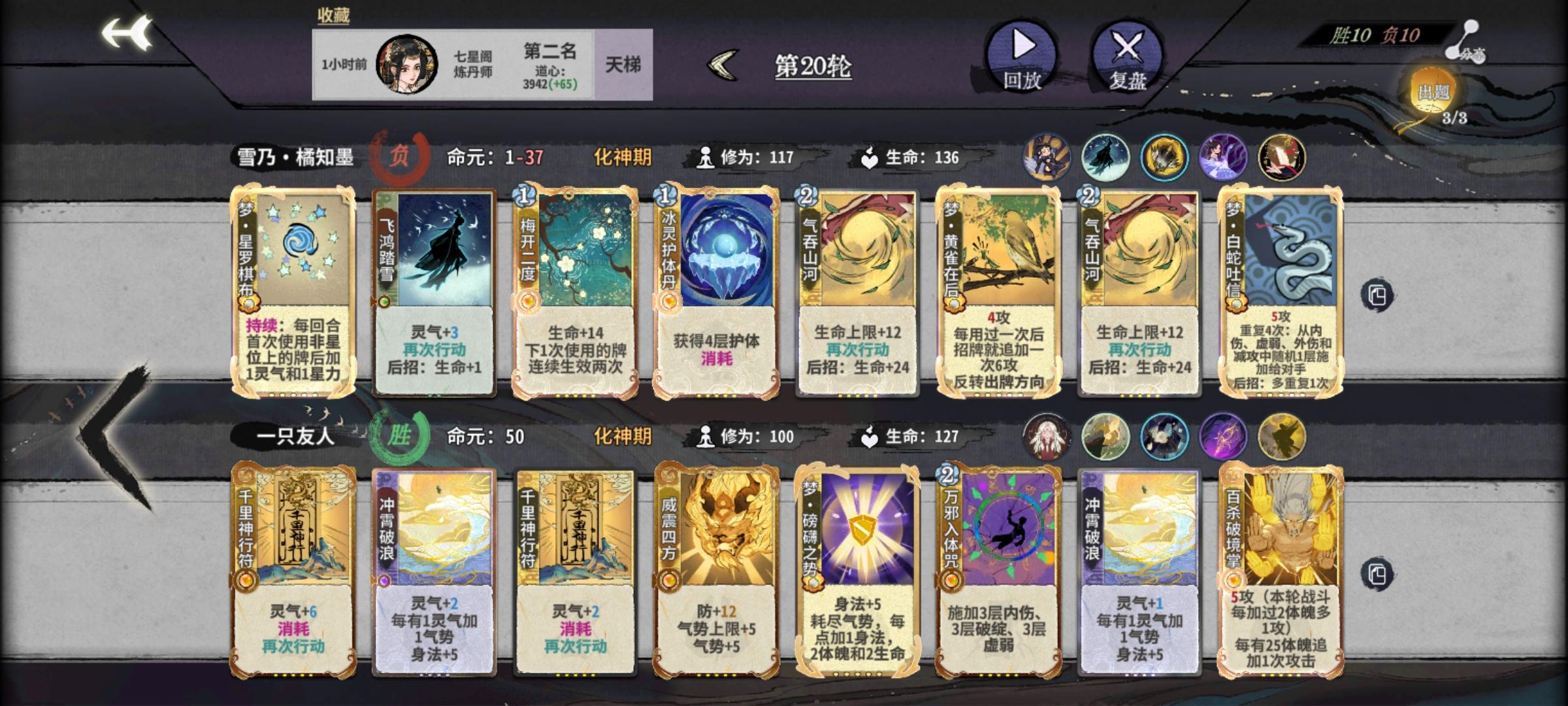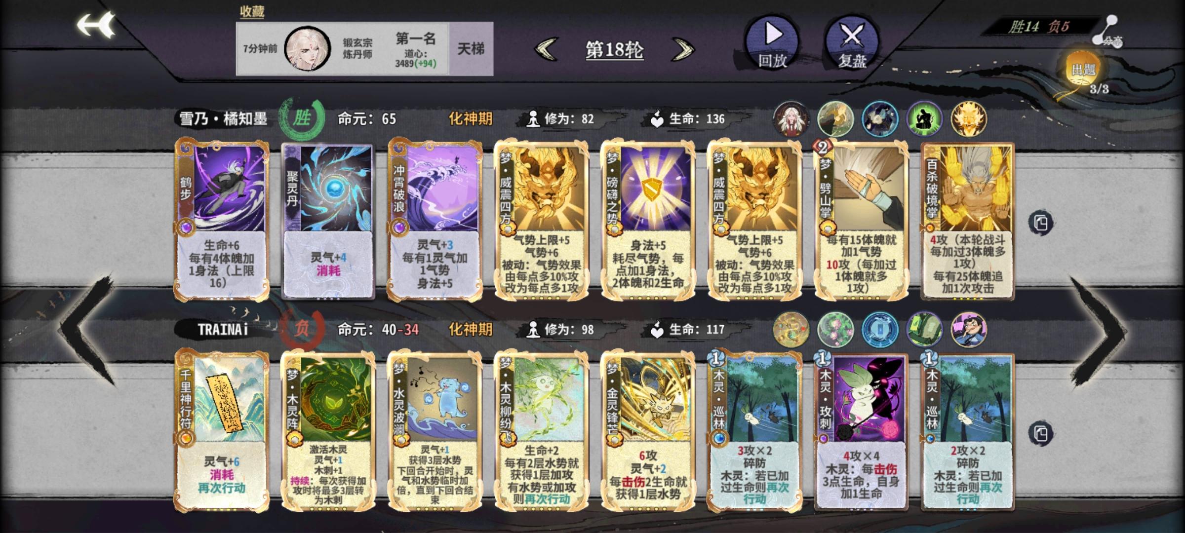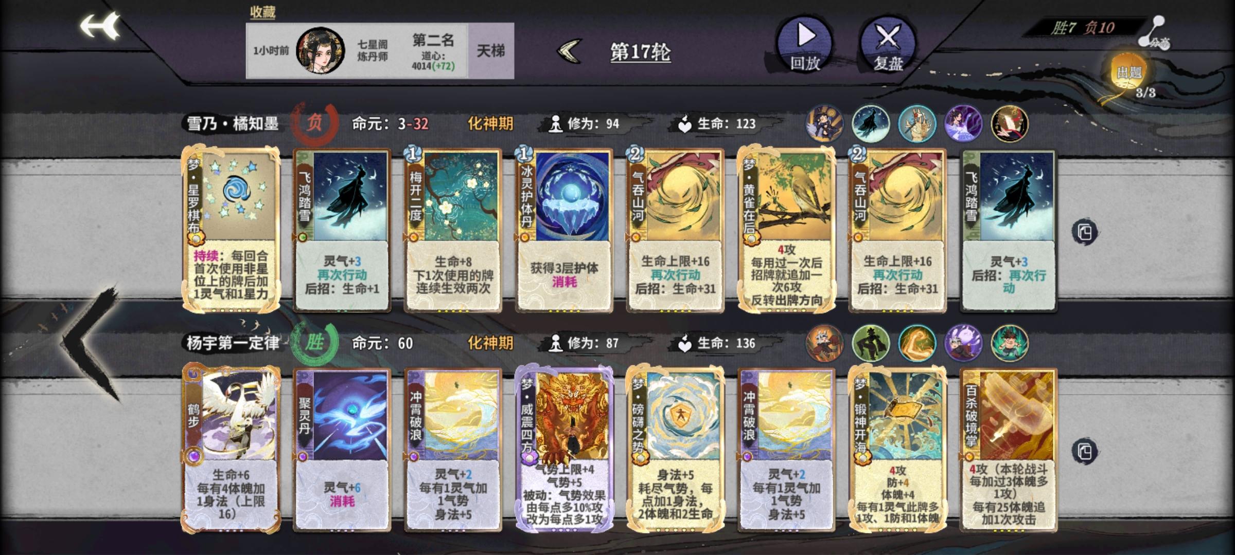 1.前言大家好,我是菜鸟玩家红尘有影,上个赛季吾行之道心榜排名第三,非常喜欢五行道盟的角色,经常研究各种五行角色的套路和卡组。因织梦赛季外面七星阁和剑宗肆虐,小弟在天梯被打得道心破碎,先有老鼠大人修为快如一匹马,小弟望尘莫及被一脚踢死,后有各种剑宗大人,剑意几刀砍小弟宛如砍瓜切菜,甚至还有七星阁各种仙女老登,小弟拼经全力也无法战胜,每当小弟卡组成形的时候,一首天音困仙区,天涯何处觅知音,小弟无奈
