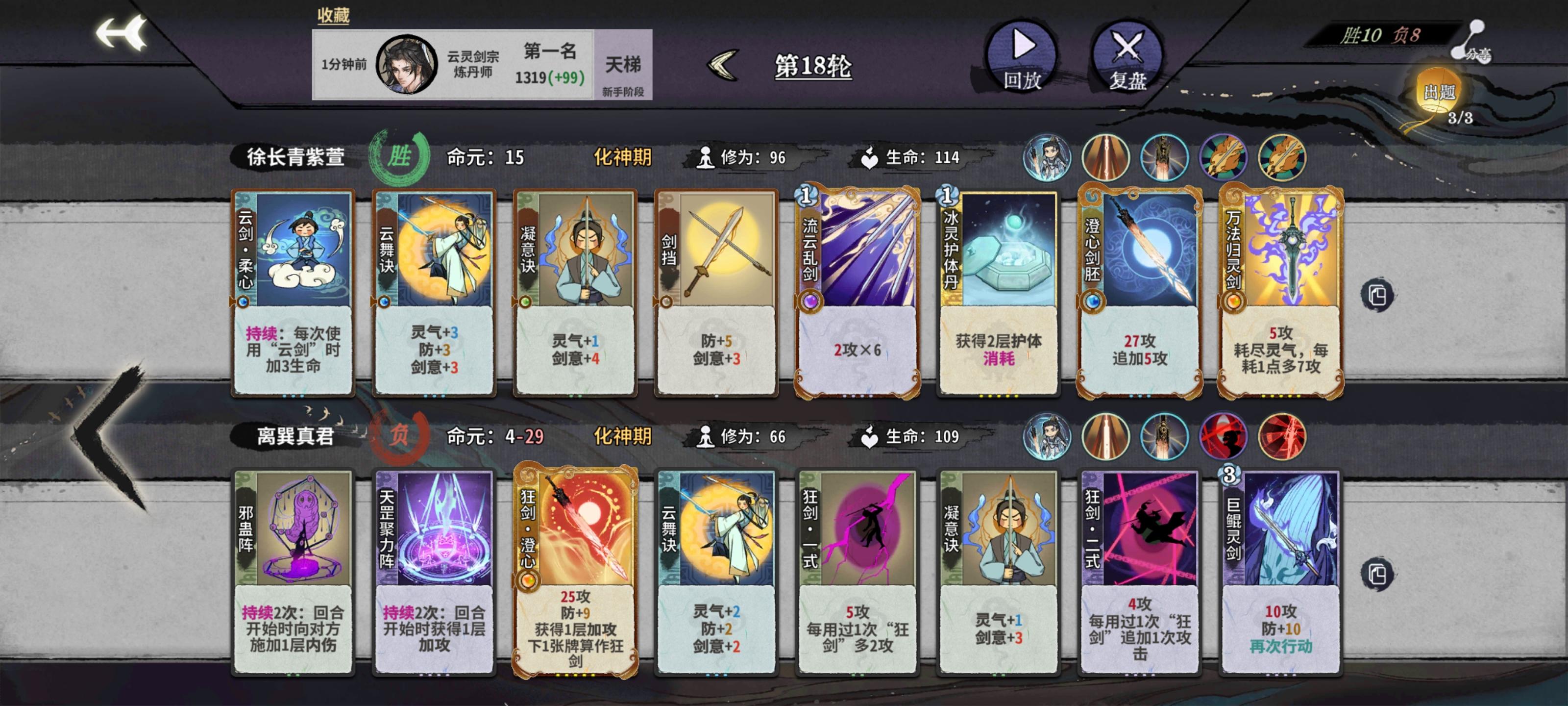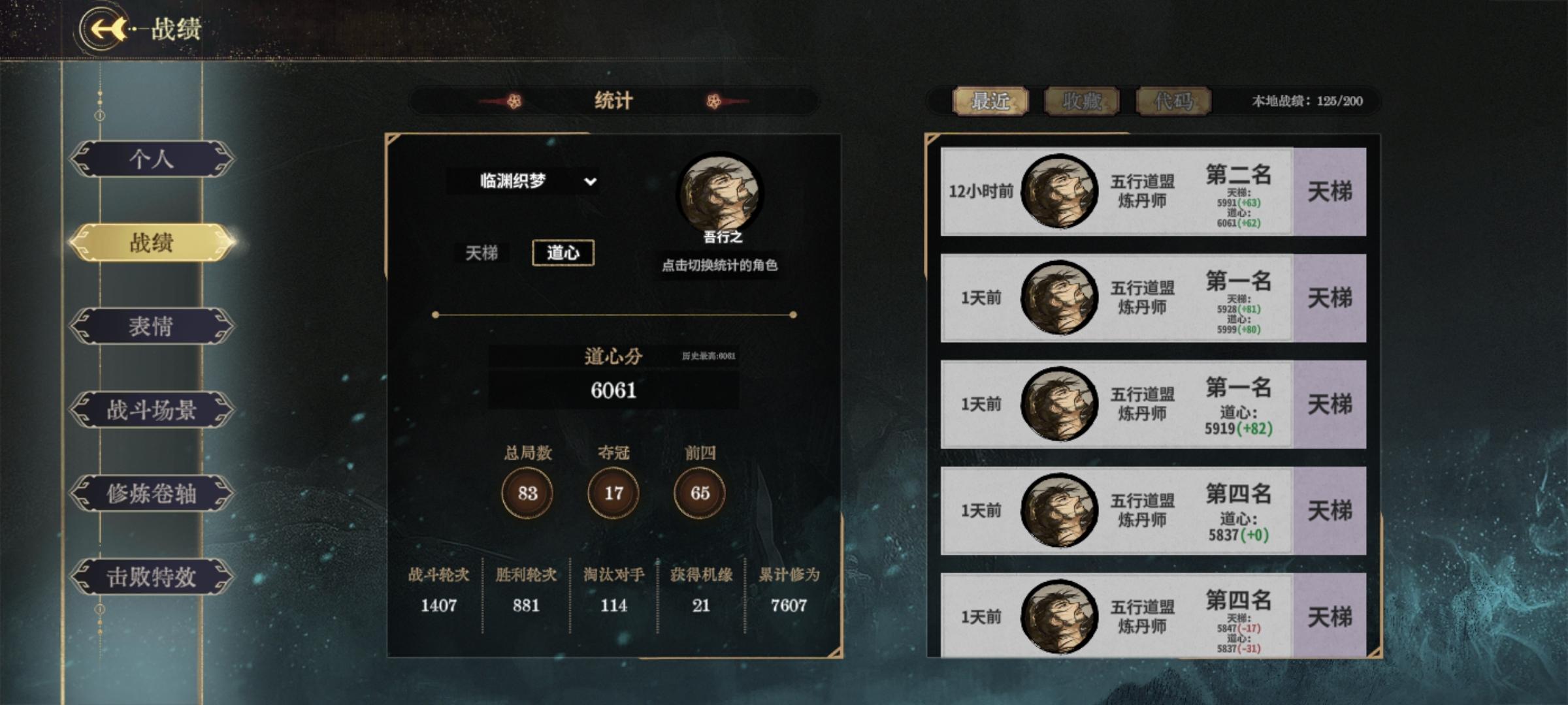 1.前言大家好,我是菜鸟玩家红尘有影,上个赛季吾行之道心榜排名第三,非常喜欢五行道盟的角色,经常研究各种五行角色的套路和卡组。因织梦赛季外面七星阁和剑宗肆虐,小弟在天梯被打得道心破碎,先有老鼠大人修为快如一匹马,小弟望尘莫及被一脚踢死,后有各种剑宗大人,剑意几刀砍小弟宛如砍瓜切菜,甚至还有七星阁各种仙女老登,小弟拼经全力也无法战胜,每当小弟卡组成形的时候,一首天音困仙区,天涯何处觅知音,小弟无奈