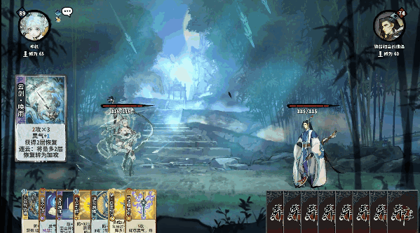 真绷不住了,这是我玩这游戏的第二把,我只能说这把天命在我,虽然没看攻略但是看到剑意可以加伤外加多重攻击这玩意我就知道该怎么整卡组了,也是非常的幸运,可以看到加剑意的全是三星卡,最后又给我来了一张加80%剑意的卡,再叠加那张无视防御以及返还剑意压低血量,最后连击卡伤害爆表,达到了160的伤害,一张卡下去对面倒欠我100多滴血,真的绷不住了