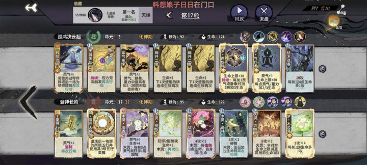 我花的赔钱指数在梦卡赛季达到了新高分享一下自救指南整体的混分思路就是化神之前尽可能提升质量,在第12轮之后开始接受自己谁也打不过的事实,祈祷对手抽不到key牌,等到4个人出局就可以美美开香槟等待下一局了💅第二轮上筑基拿木印,副职炼丹师。第三轮开始D梦卡,根据梦卡和道韵定阵,确保元婴期和化神初期有足够的战力如果来了梦木灵阵直接定阵,从金丹期开始全部拿修为。如果道韵有答辩,金丹期D一张泉涌,也