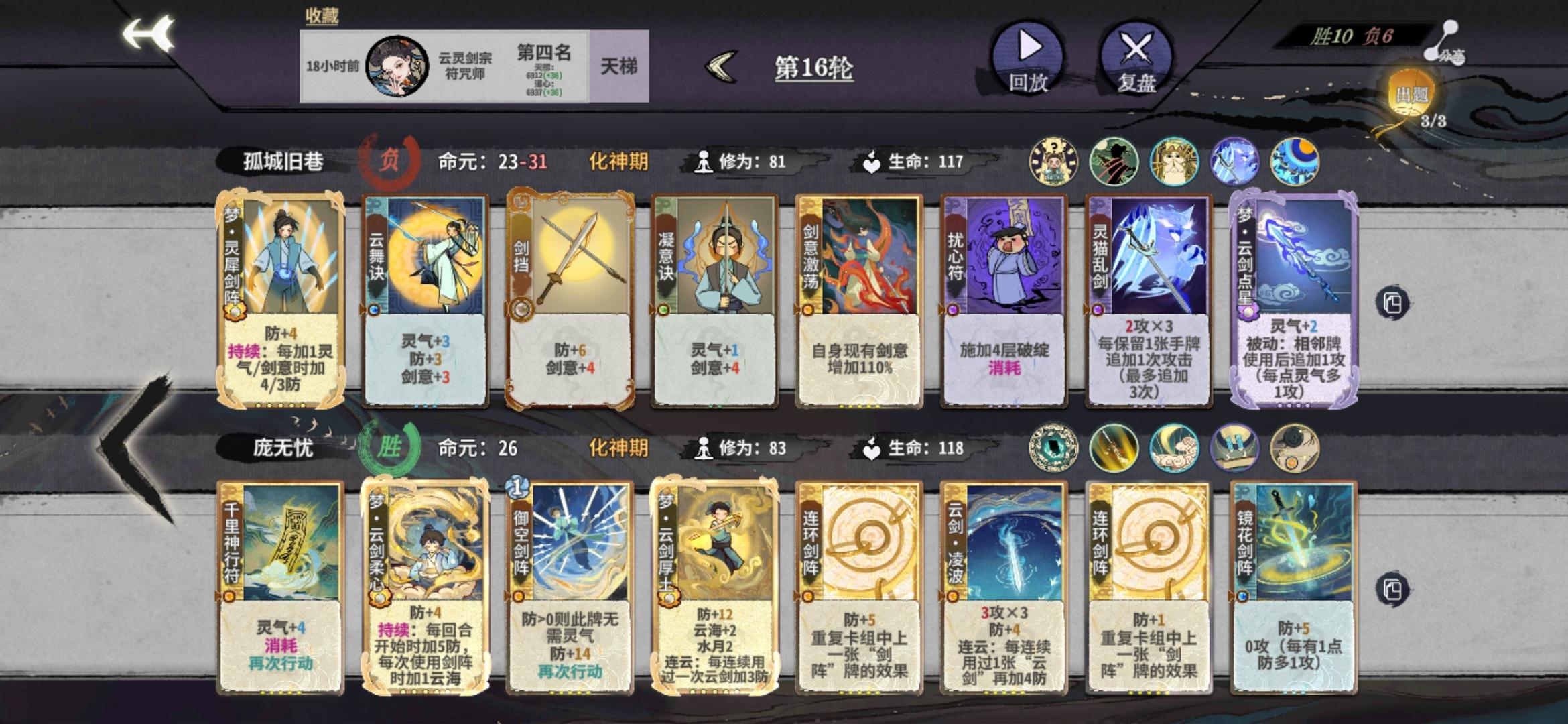 我花的赔钱指数在梦卡赛季达到了新高分享一下自救指南整体的混分思路就是化神之前尽可能提升质量,在第12轮之后开始接受自己谁也打不过的事实,祈祷对手抽不到key牌,等到4个人出局就可以美美开香槟等待下一局了💅第二轮上筑基拿木印,副职炼丹师。第三轮开始D梦卡,根据梦卡和道韵定阵,确保元婴期和化神初期有足够的战力如果来了梦木灵阵直接定阵,从金丹期开始全部拿修为。如果道韵有答辩,金丹期D一张泉涌,也