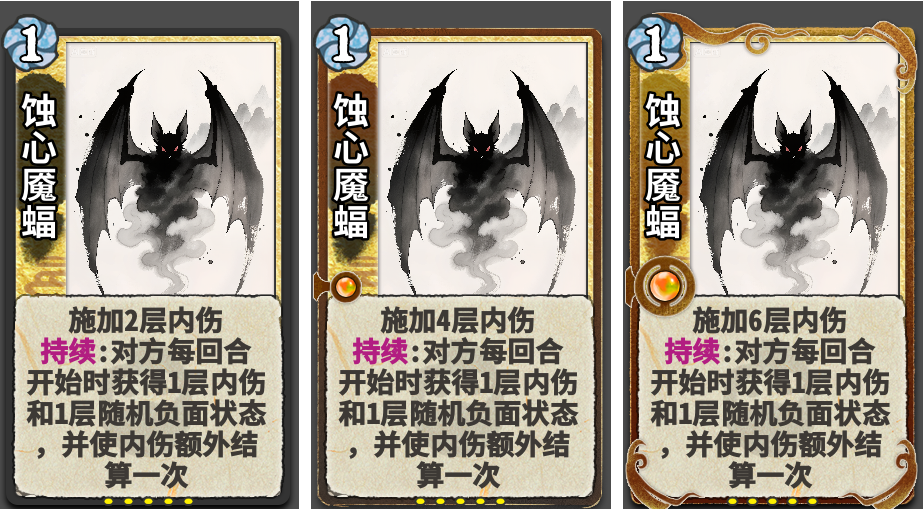 第一个鼎,和梅开合成下两张卡生效三次,百杀每26体追加2次攻击,百体打10拳,连环重复两张等等,和角色卡合成没认真看,已经可以造出不少怪物来了。第二灯,对策卡,灯一动,卡一动前期赚点命元代替灵气卡,后期只能对策,后期卡蓝太拖节奏,回响也赚不了命元第三蝙蝠,内伤大哥,每回合两次内伤和随机负面,出困和虚弱都对物理输出卡组有效,无内伤也能有收益