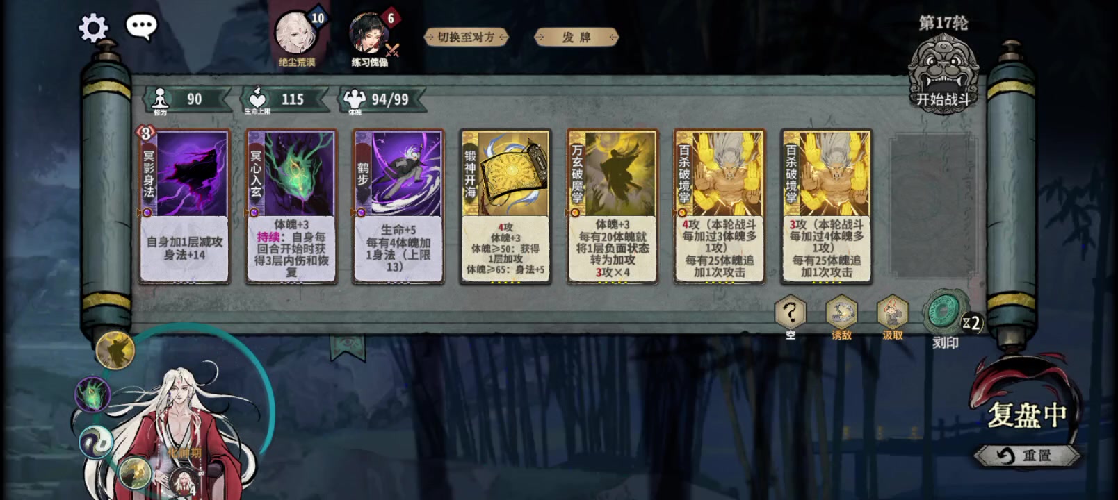 这把是真的,运气不好评吧,原本想玩奶燕的,结果没有刷到一张心法,然后前期就一直输吧,没有成型的牌,升化神后给了张五雷凑合着用,排名一直稳定最后,然后就开始运气了,给了一个门派秘法,这可比五雷好用多了,打花时断了两次她的腾浪,打姬哥也是不知道怎么就赢了,不过说实话,这些姬哥的牌也挺抽象的,后面看出了个天元心法的刻印就用了,结果复盘发现不用这个刻印,用以前的就能赢了,总之就是,靠运气,一路从第七打到第