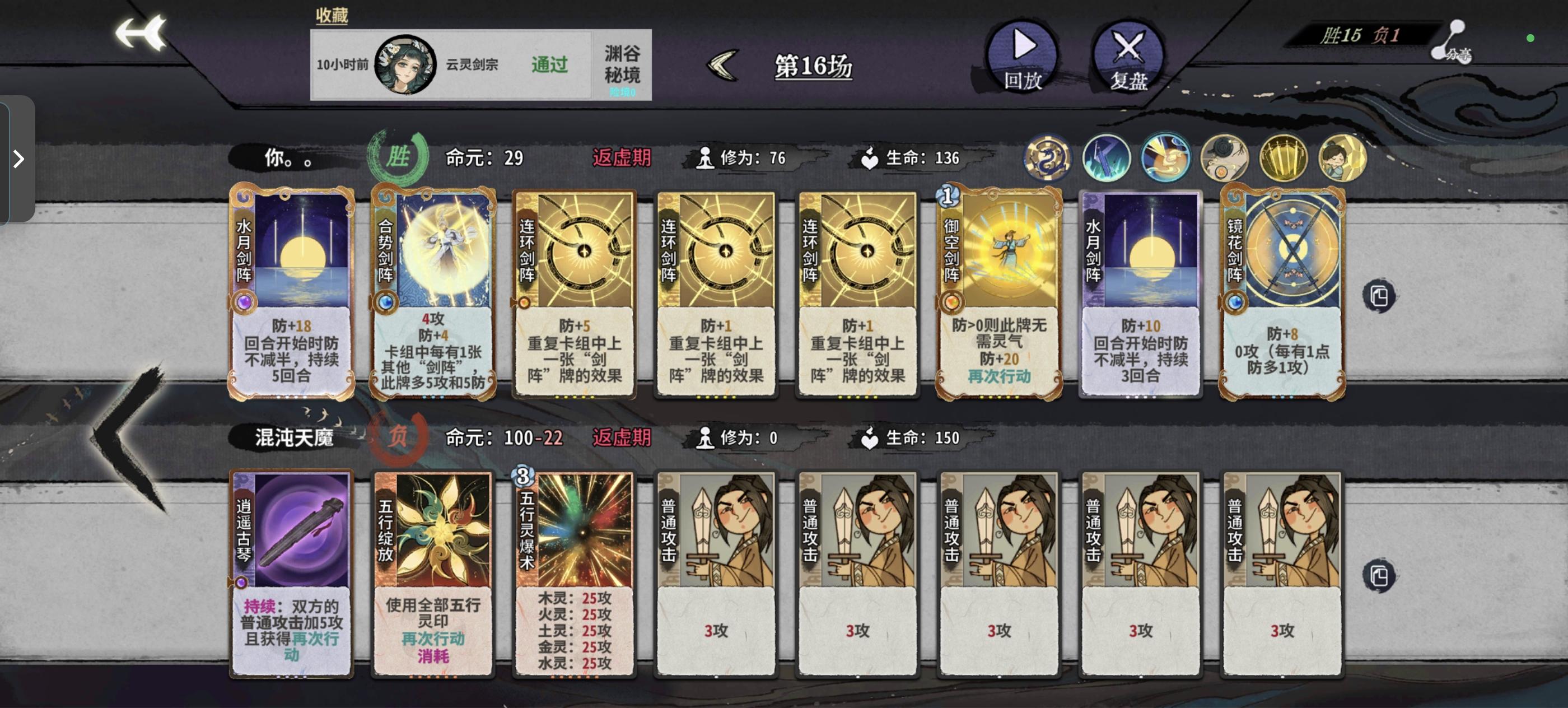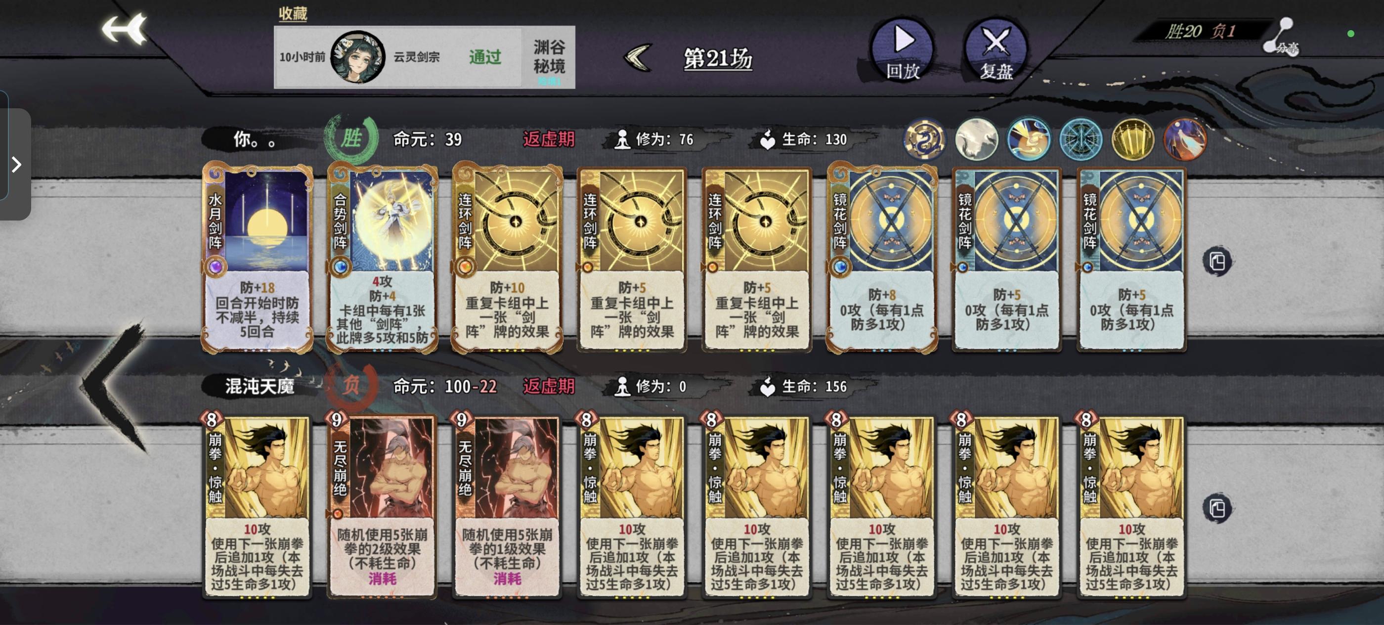 游戏昵称:流水无情叹落花UID:69608267438c9455b20e512b1.卡组特点:剑阵流派,攻防兼备,有效抵挡混沌天魔三动爆发2.核心仙命:金丹期龙鳞保命必拿,能平稳度过前期,有剑阵守护优先拿剑阵守护,在没有水月剑阵的情况下很好用3.核心卡牌:合势剑阵,由于合势剑阵的被动效果,当卡组中八张都为剑阵时,满级合势剑阵可打出高达39/39攻防,利用连环剑阵重复效果配合镜花剑阵收尾,在