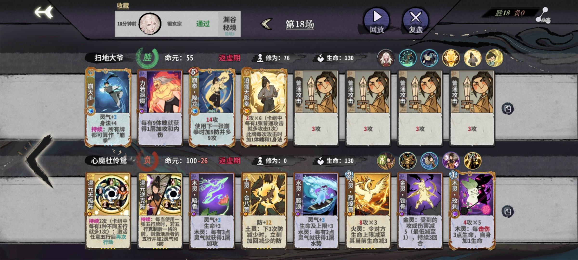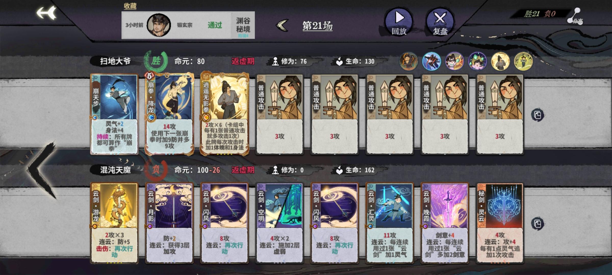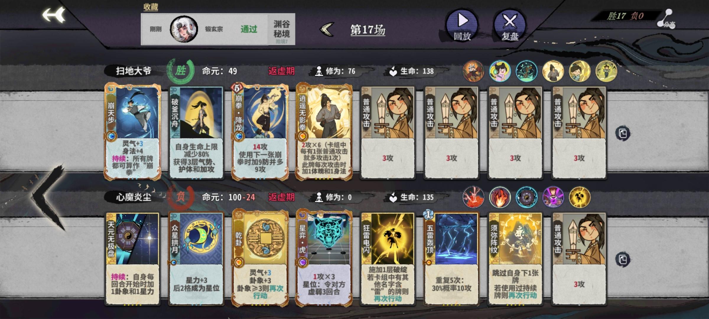 游戏昵称:流水无情叹落花UID:69608267438c9455b20e512b1.卡组特点:剑阵流派,攻防兼备,有效抵挡混沌天魔三动爆发2.核心仙命:金丹期龙鳞保命必拿,能平稳度过前期,有剑阵守护优先拿剑阵守护,在没有水月剑阵的情况下很好用3.核心卡牌:合势剑阵,由于合势剑阵的被动效果,当卡组中八张都为剑阵时,满级合势剑阵可打出高达39/39攻防,利用连环剑阵重复效果配合镜花剑阵收尾,在