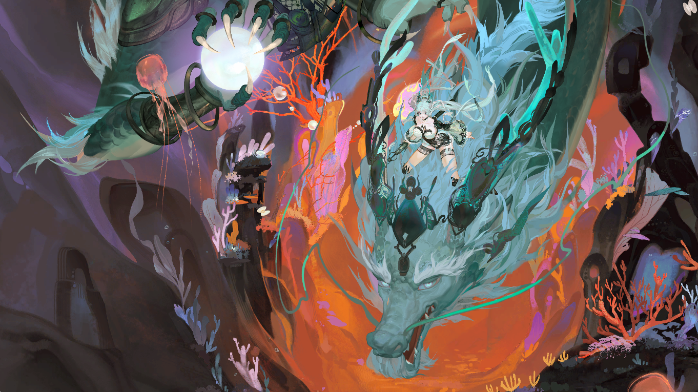 【逸品衣着】龙瑶-御九霄-----------衣着画本天光海色映蓬莱,雾里云门次第开。欲取明珠遮旧梦,飞龙舞破凤凰台。沧渊之下,一道清影破暗而行。龙瑶手中戟剑引路,身下龙形器灵化为一道劈开深海的锋锐流光,载着她径直坠向更深的未知。衣裙猎猎,逆涌的暗流却无法再令她动摇分毫。这一次,她手中所执非是惶恐时抓住的珊瑚,而是足以定分波涛的锋芒;眼中所见亦非绝望的黑暗,而是必须守护的归途。冲